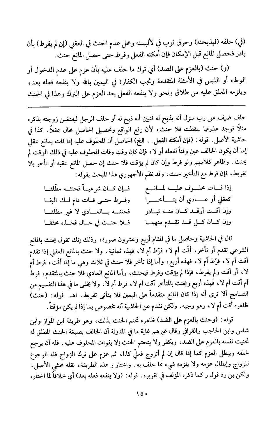 قال في الحاشية : وحاصل ما في المقام أربعة وعشرون صورة وذلك أنك تقول يحنث بالمانع الشرعي تقدم أو تأخر أقت أم لا فرط أم لا فهذه ثمانية ولا حنث بالمانع العقلي إذا تقدم أقت أم لا فرط أم لا فهذه أربع وأما إذا تأخر فلا حنث في ثلاث : وهي ما إذا أقت فرط أم لا أو لم يؤقت ولم يفرط فإذا لم يؤقت وفرط فيحنث وأما المانع العادي فلا حنث بالمتقدم فرط أم لا أقت أم لا ؛ فهذه أربع ويحنث بالمتأخر أقت أم لا فرط أم لا ولا يخفي ما في هذا التقسيم من التسامح ألا ترى أنه إذا كان المنع متقدما على اليمين فلا يتأتى تفريط ( اه )