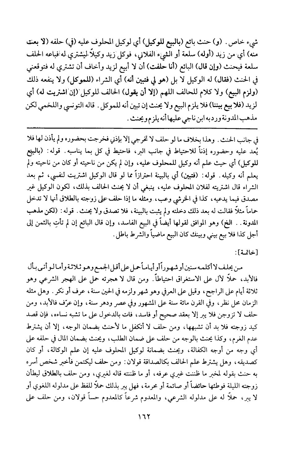 خاتمة : من يحلف لا أكلمه سنين أو شهورا أو أياما حمل على أقل الجمع وهو ثلاثة وأما لو أتى ب أل فالأبد حملا ل أل على الاستغراق احتياطا ومن قال : لا هجرته حمل على الهجر الشرعي وهو ثلاثة أيام على الراجح وقيل : على العرفي وهو شهر ولزمه في الحين سنة عرف أو نكر وهل مثله الزماني محل نظر وفي القرن مائة سنة على المشهور وفي عصر ودهر : سنة وإن عرف فالأبد ومن حلف لأتزوجن فلا يبر إلا بعقد صحيح أو فاسد فات بالدخول على من تشبه نساءه فإن قصد كيد زوجته فلا بد أن تشبهها . ومن حلف لا أتكفل مالا حنث بضمان الوجه إلا أن يشترط عدم الغرم وكذا يحنث بالوجه من حلف على ضمان الطلب ويحنث بضمان المال في حلفه على أي وجه من أوجه الكفالة ويحنث بضمانه لوكيل المحلوف عليه إن علم الوكالة أو كان كصديقه وهل يشترط علم الحالف بكالصداقة ؟ قولان ومن حلف ليكتمن فأخبر شخصا أسره به حنث بقوله لمخبر ما ظننت غيري عرفه أو ما ظننته قاله لغيري . ومن حلف بالطلاق ليطأن زوجته الليلة فوطئها حائضا أو صائما أو محرمة فهل يبر بذلك حملا للفظ على مدلوله اللغوي أو لا يبر حملا له على مدلوله الشرعي ؟ والمعدوم شرعا كالمعدوم حسا قولان ومن حلف على