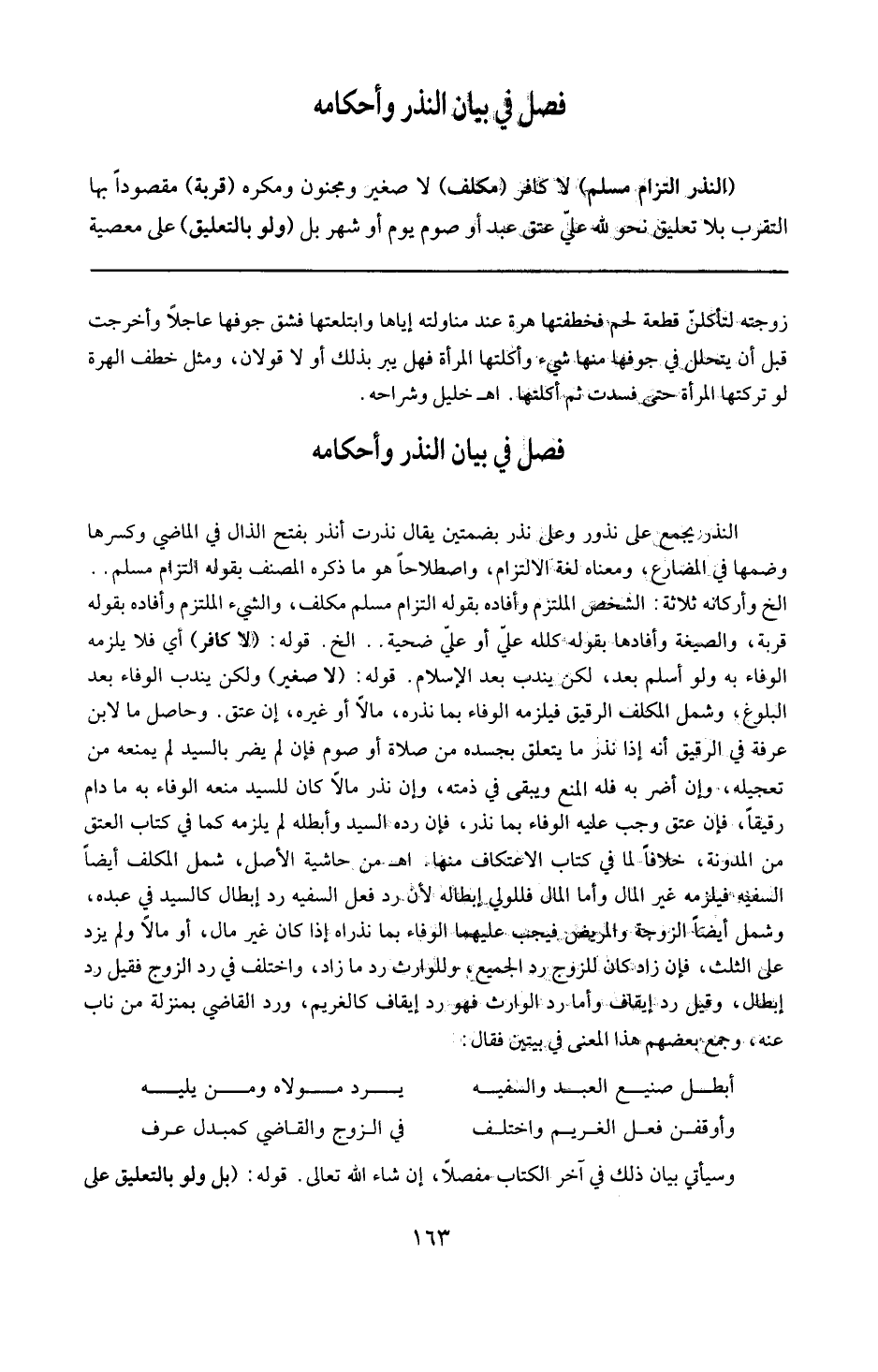 وحاصل ما لابن عرفة في الرقيق : أنه إذا نذر ما يتعلق بجسده من صلاة أو صوم فإن لم يضر بالسيد لم يمنعه من تعجيله وإن أضر به فله المنع ويبقى في ذمته وإن نذر مالا كان للسيد منعه الوفاء به ما دام رقيقا فإن عتق وجب عليه الوفاء بما نذر فإن رده السيد وأبطله لم يلزمه كما في كتاب العتق من المدونة خلافا لما في كتاب الاعتكاف منها ( ا هـ من حاشية الأصل ) . وشمل المكلف أيضا السفيه فيلزمه غير المال وأما المال فللولي إبطاله لأن رد فعل السفيه إبطال كالسيد في عبده . وشمل أيضا الزوجة والمريض فيجب عليهما الوفاء بما نذراه إذا كان غير مال أو مالا ولم يزد على الثلث فإن زاد كان للزوج رد الجميع وللوارث رد ما زاد . واختلف في رد الزوج فقيل : رد إبطال وقيل رد إيقاف وأما رد الوارث فهو رد إيقاف كالغريم ورد القاضي بمنزلة من ناب عنه وجمع بعضهم هذا المعنى في بيتين فقال : (