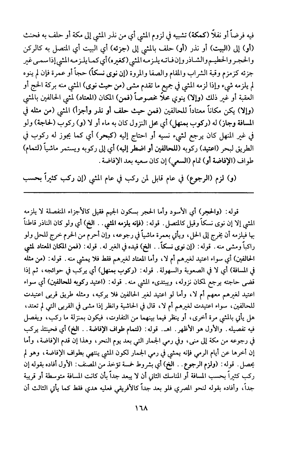 قوله : 16 ( فإنه يلزمه المشي ) إلخ : أي ولو كان الناذر قاطنا بها فيلزمه أن يخرج إلى الحل ويأتي بعمرة ماشيا في رجوعه وإن أحرم من الحرم خرج للحل ولو راكبا ومشي منه .
