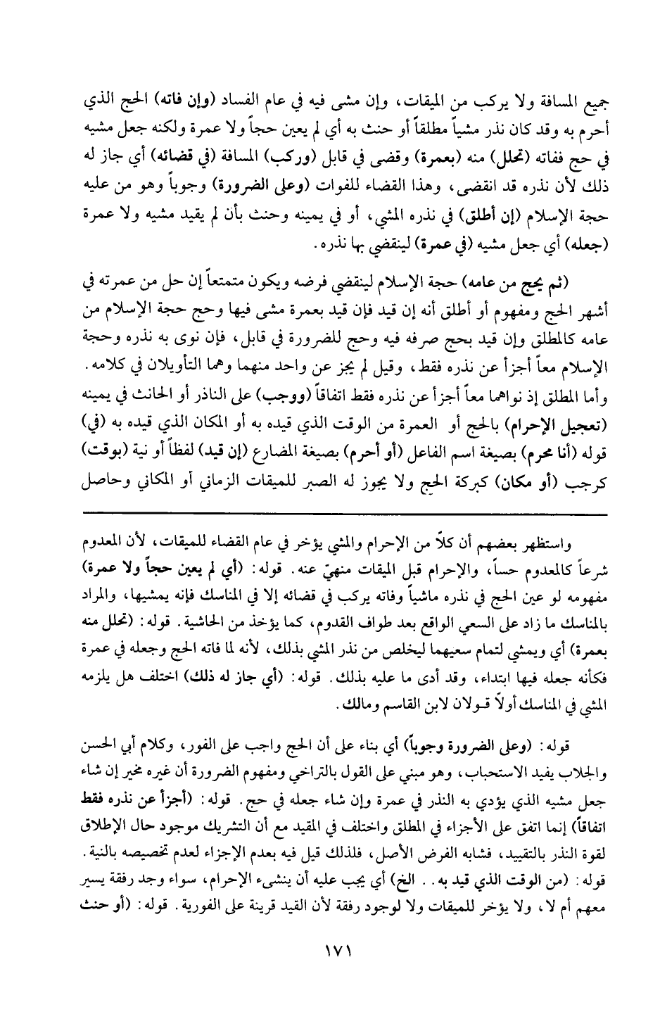 قوله : 16 ( وعلى الصرورة وجوبا ) : أي بناء على أن الحج واجب على الفور وكلام أبي الحسن والجلاب يفيد الاستحباب وهو مبني على القول بالتراخي ومفهوم الصرورة أن غيره مخير إن شاء جعل مشيه الذي يؤدي به النذر في عمرة وإن شاء جعله في حج .