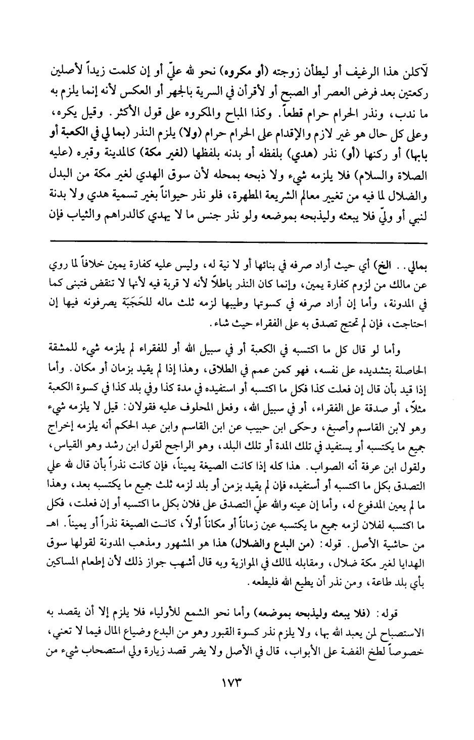 قوله : 16 ( فلا يبعثه وليذبحه بموضعه ) : وأما نحو الشمع للأولياء فلا يلزم إلا أن يقصد به الاستصباح لمن يعبد الله بها ولا يلزم نذر كسوة القبور وهو من البدع وضياع المال فيما لا يعني خصوصا لطخ الفضة على الأبواب . قال في الأصل : ولا يضر قصد زيارة ولي واستصحاب شيء من