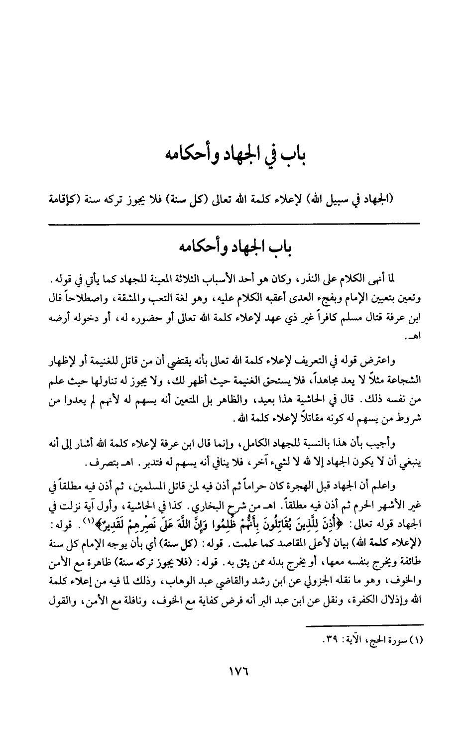 قوله : 16 ( فلا يجوز تركه سنة ) : ظاهره مع الأمن والخوف وهو ما نقله الجزولي عن ابن رشد والقاضي عبد الوهاب وذلك لما فيه من إعلاء كلمة الله وإذلال الكفرة ونقل عن ابن عبد البر أنه فرض كفاية مع الخوف ونافلة مع الأمن والقول
