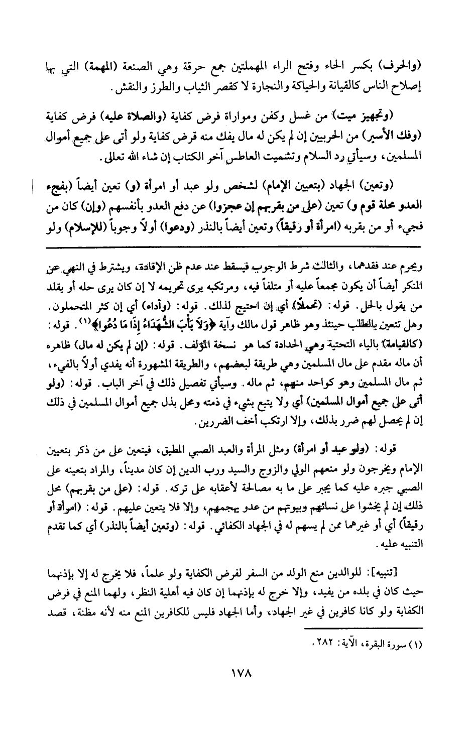 تنبيه : للوالدين منع الولد من السفر لفرض الكفاية ولو علما فلا يخرج له إلا بإذنهما حيث كان في بلده من يفيده وإلا خرج له بغير إذنهما إن كان فيه أهلية النظر . ولهما المنع في فرض الكفاية ولو كانا كافرين في غير الجهاد . وأما الجهاد فليس للكافرين المنع منه لأنه مظنة قصد