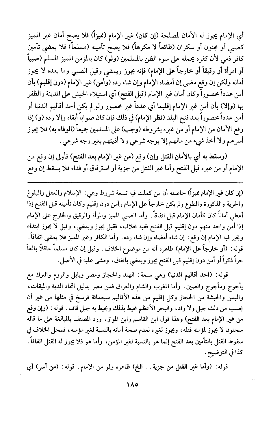 قوله : 16 ( أحد أقاليم الدنيا ) : وهي سبعة : الهند والحجاز ومصر وبابل والروم والترك مع يأجوج ومأجوج والصين . وأما المغرب والشام والعراق فمن مصر بدليل اتحاد الدية والميقات واليمن والحبشة من الحجاز . وكل إقليم من هذه الأقاليم سبعمائة فرسخ في مثلها من غير أن يحسب من ذلك جبل ولا واد . والبحر الأعظم محيط بذلك ويحيط به جبل قاف . 16 ( قوله : 16 ( وإن وقع من غير الإمام بعد الفتح ) : وهذا قول ابن القاسم وابن المواز ورد المصنف بالمبالغة على ما قاله سحنون : لا يجوز لمؤمنه قتله ويجوز لغيره عدم صحة أمانه بالنسبة لغير مؤمنه . فمحل الخلاف في سقوط القتل بالتأمين بعد الفتح إنما هو بالنسبة لغير المؤمن وأما هو فلا يجوز له القتل اتفاقا كذا في التوضيح .