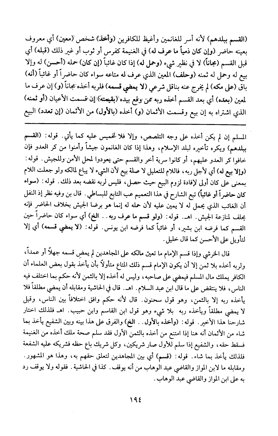 قوله : 16 ( القسم ببلدهم ) ويكره تأخيره لبلد الإسلام وهذا إذا كان الغانمون جيشا وأمنوا من كر العدو فإن خافوا كر العدو عليهم أو كانوا سرية أخروا القسم حتى يعودوا لمحل الأمن وللجيش . ) 16 (