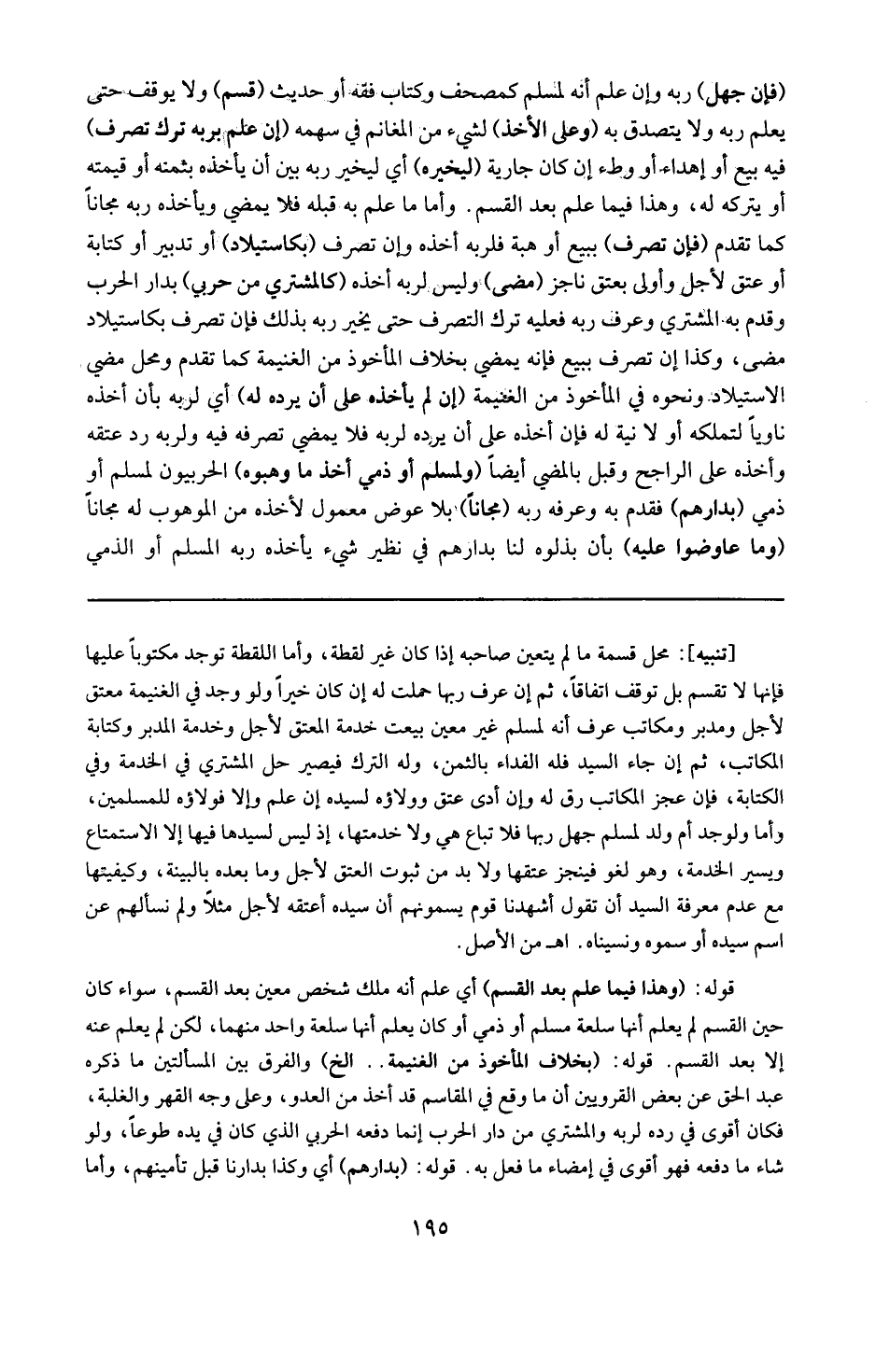 تنبيه : محل قسمة ما لم يتعين صاحبه إذا كان غير لقطة ) 16 ( وأما اللقطة توجد مكتوبا عليها فإنها لا تقسم بل توقف اتفاقا ثم إن عرف ربها حملت له إن كان خيرا ولو وجد في الغنيمة معتق لأجل ومدبر ومكاتب عرف أنه لمسلم غير معين بيعت خدمة المعتق لأجل وخدمة المدبر وكتابة المكاتب ثم إن جاء السيد فله الفداء بالثمن وله الترك فيصير حق المشتري في الخدمة وفي الكتابة فإن عجز المكاتب رق له وإن أدى عتق وولاؤه لسيده إن علم وإلا فولاؤه للمسلمين . وأما لو وجد أم ولد لمسلم جهل ربها فلا تباع هي ولا خدمتها إذ ليس لسيدها فيها إلا الاستماع ويسير الخدمة وهو لغو فينجز عتقها ولا بد من ثبوت العتق لأجل وما بعده بالبينة وكيفيتها مع عدم معرفة السيد أن تقول : أشهدنا قوم يسمونهم أن سيده أعتقه لأجل مثلا ولم نسألهم عن اسم سيده أو سموه ونسيناه ( اه . من الأصل ) .