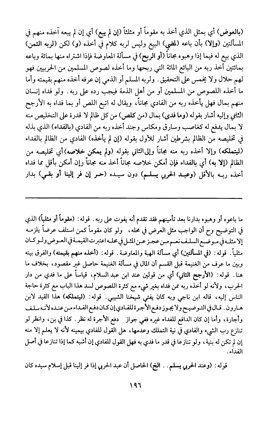 قوله : 16 ( الأرجح الثاني ) : أي من قولين عند ابن عبد السلام قياسا على ما فدى من دار الحرب . ولأنه لو أخذه ربه ممن فداه بغير شيء مع كثرة اللصوص لسد هذا الباب مع كثرة حاجة الناس إليه ابن ناجي وبه كان يفتى شيخنا الشبيبي . ) 16 (