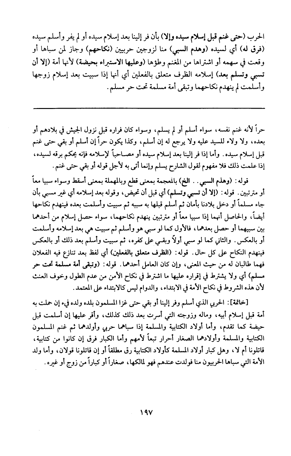 خاتمة : الحربي الذي أسلم وفر إلينا أو بقي حتى غزا المسلمون بلده : ولده فيء إن حملت به أمه قبل إسلام أبيه وماله وزوجته التي أسرت بعد ذلك كذلك ) 16 ( وأقر عليها إن أسلمت قبل حيضة كما تقدم . وأما أولاد الكتابية والمسلمة إذا سباهما حربي وأولدهما ثم غنم المسلمون الكتابية والمسلمة : وأولادهما الصغار أحرار تبعا لأمهم . وأما الكبار فرق إن كانوا من كتابية قاتلونا أم لا وهل كبار أولاد المسلمة كأولاد الكتابية رق مطلقا أو إن قاتلونا ؟ قولان وأما ولد الأمة التي سباها الحربيون منا فولدت عنده فهو لمالكها صغارا أو كبارا من زوج أو غيره .