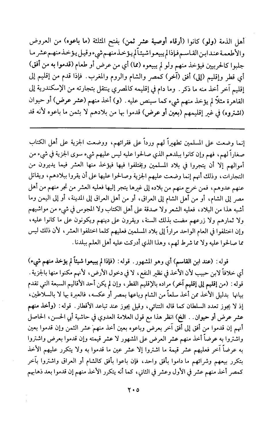 إنما وضعت على المسلمين تطهيرا لهم وردا على فقرائهم ووضعت الجزية على أهل الكتاب صغارا لهم فهم وإن كانوا ببلدهم الذي صالحوا عليه ليس عليهم شيء سوى الجزية في شيء من أموالهم إلا أن يتجروا في بلاد المسلمين ويختلفوا فيها . فيؤخذ منهم العشر فيما يديرون من التجارات وذلك أنهم إنما وضعت عليهم الجزية وصالحوا عليها على أن يقروا ببلادهم ويقاتل عنهم عدوهم فمن خرج من بلاده منهم إلى غيرها يتجر فعليه العشر من تجر منهم من أهل مصر إلى الشام أو من أهل الشام إلى العراق أو من أهل العراق إلى المدينة أو إلى اليمن وما أشبه هذا من البلاد فعليه العشر ولا صدقة على أهل الكتاب ولا المجوس في شيء من مواشيهم ولا ثمارهم ولا زروعهم مضت بذلك السنة ويقرون على دينهم ويكونون على ما كانوا عليه وإن اختلفوا في العام الواحد مرارا إلى بلاد المسلمين فعليهم كلما اختلفوا العشر لأن ذلك ليس مما صالحوا عليه ولا مما شرط لهم وهذا الذي أدركت عليه أهل العلم ببلدنا .