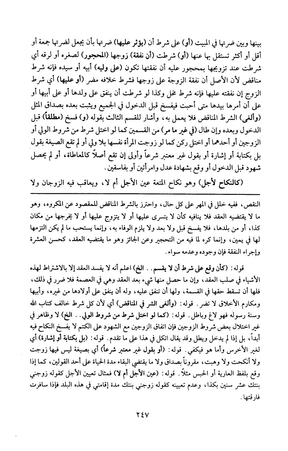النقص ففيه خلل في المهر على كل حال واحترز بالشرط المناقض للمقصود عن المكروه وهو ما لا يقتضيه العقد فلا ينافيه كأن لا يتسرى عليها أو لا يتزوج عليها أو لا يخرجها من مكان كذا أو من بلدها فلا يفسخ قبل ولا بعد ولا يلزم الوفاء به وإنما يستحب ما لم يكن التزمها لها في يمين وإنما كره لما فيه من التحجير . وعن الجائز وهو ما يقتضيه العقد كحسن العشرة وإجراء النفقة فإن وجوده وعدمه سواء .