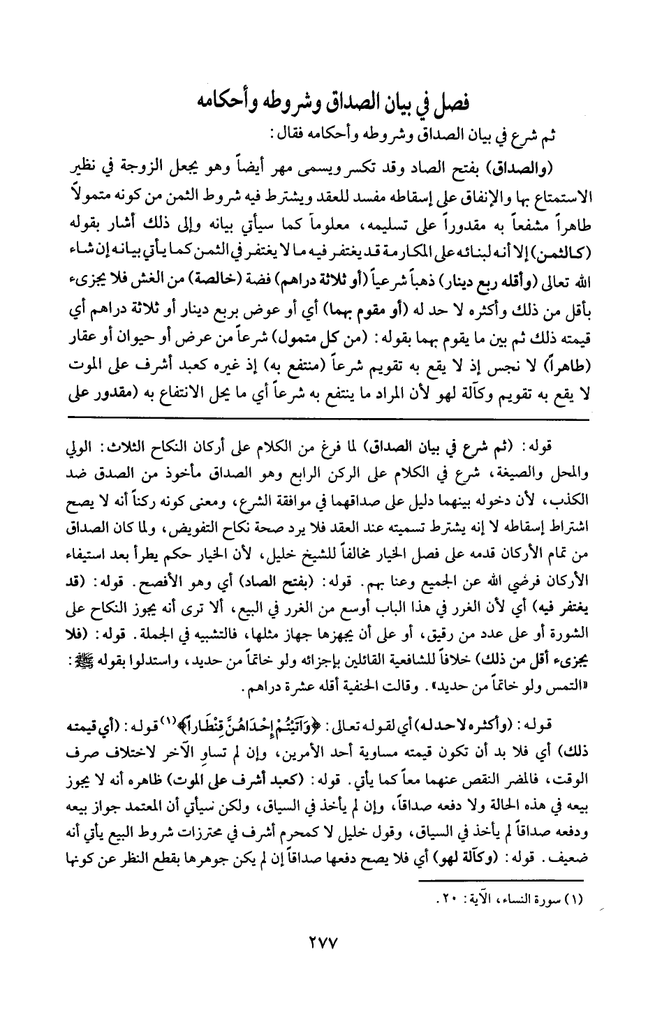 قوله : 16 ( ثم شرع في بيان الصداق ) : لما فرغ من الكلام على أركان النكاح الثلاث الولي والمحل والصيغة شرع في الكلام على الركن الرابع وهو الصداق مأخوذ من الصدق ضد الكذب لأن دخوله بينهما دليل على صدقهما في موافقة الشرع ومعنى كونه ركنا أنه لا يصح اشتراط إسقاطه لا أنه يشترط تسميته عند العقد فلا يرد صحة نكاح التفويض ولما كان الصداق من تمام الأركان قدمه على فصل الخيار مخالفا للشيخ خليل لأن الخيار حكم يطرأ بعد استيفاء الأركان فرضى الله عن الجميع وعنا بهم .