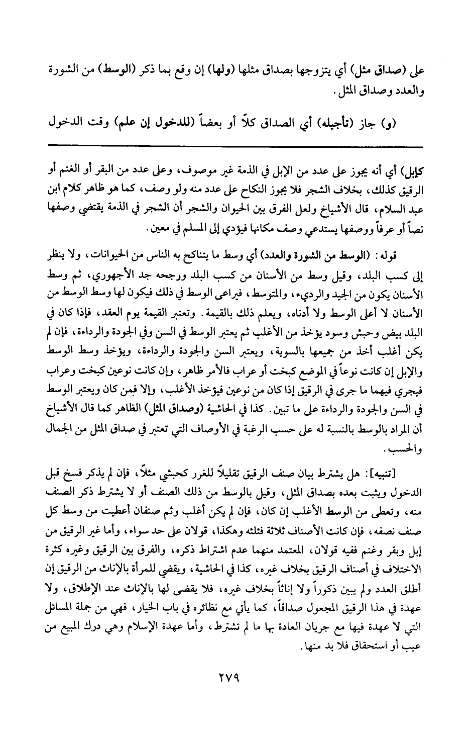 تنبيه : هل يشترط بيان صنف الرقيق تقليلا للغرر كحبشي مثلا فإن لم يذكر فسخ قبل الدخول ويثبت بعده بصداق المثل وقيل بالوسط من ذلك الصنف أو لا يشترط ذكر الصنف منه وتعطى من الوسط الأغلب إن كان فإن لم يكن أغلب وثم صنفان أعطيت من وسط كل صنف نصفه فإن كانت الأصناف الثلاثة فثلثه وهكذا ؟ قولان على حد سواء وأما غير الرقيق من إبل وبقر وغنم ففيه قولان المعتمد منها عدم اشتراط ذكره والفرق بين الرقيق وغيره كثرة الاختلاف في أصناف الرقيق بخلاف غيره )6 ( كذا في الحاشية ويقضى للمرأة بالإناث من الرقيق إن أطلق العدد ولم يبين ذكورا ولا إناثا بخلاف غيره فلا يقضى لها بالإناث عند الإطلاق ولا عهدة في هذا الرقيق المجعول صداقا كما يأتي مع نظائره في باب الخيار فهي من جملة المسائل التي لا عهدة فيها مع جريان العادة بها ما لم تشترط . وأما عهدة الإسلام وهي درك المبيع من عيب أو استحقاق فلا بد منها