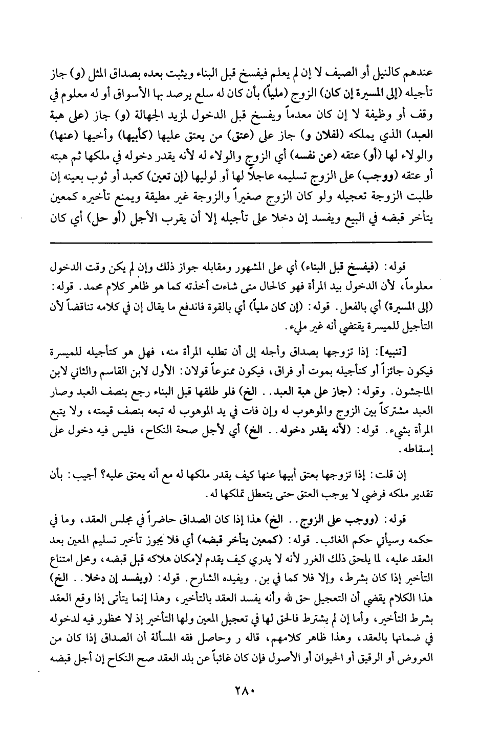 قوله : 16 ( فيفسخ قبل البناء ) : أي على المشهور ومقابلة جواز ذلك وإن لم يكن وقت الدخول معلوما لأن الدخول بيد المرأة فهو كالحال متى شاءت أخذته كما هو ظاهر كلام محمد .