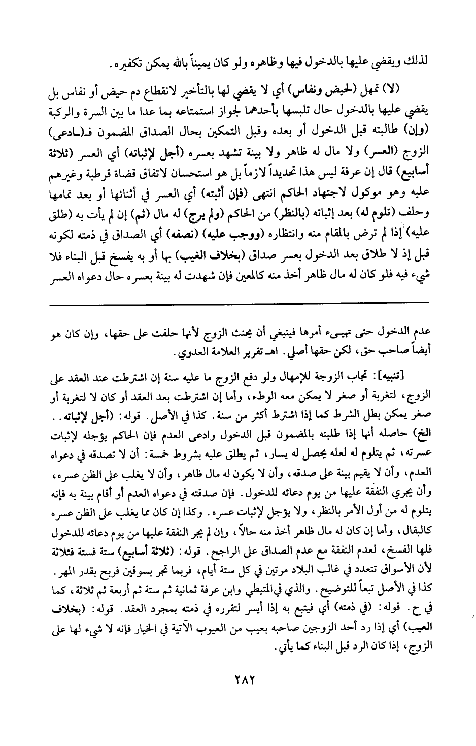 تنبيه : تجاب الزوجة للإمهال ولدفع الزوج ما عليه سنة أن اشترطت عند العقد على الزوج لتغربة أو صغر يمكن معه الوطء وأما إن اشترطت بعد العقد أو كان لا لتغربة أو صغر يمكن بطل الشرط كما إذا اشترط أكثر من سنة كذا في الأصل .