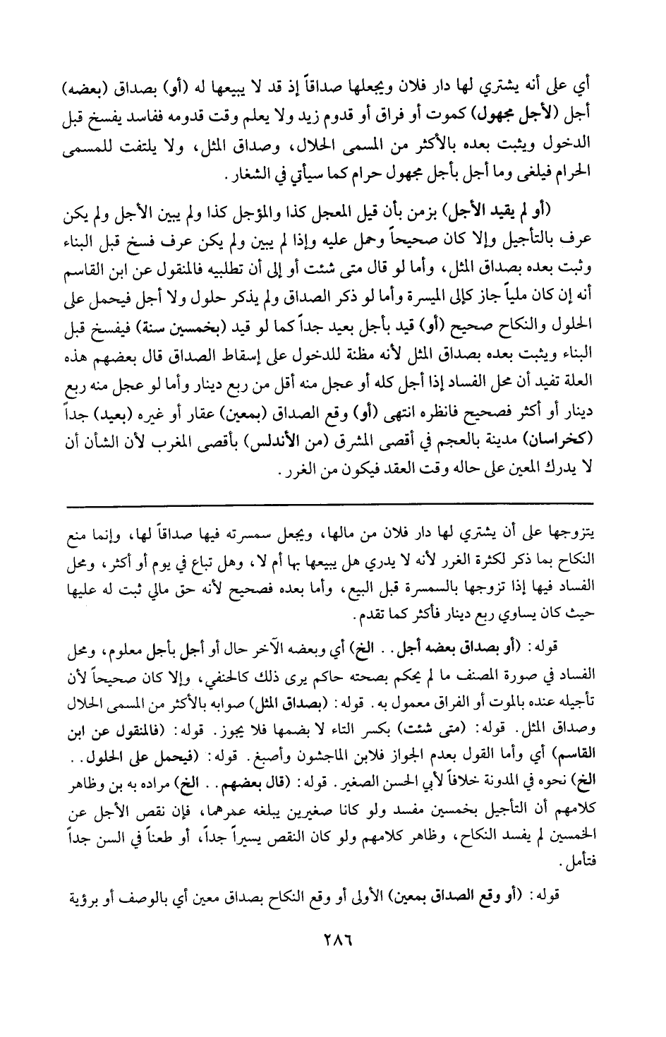 قوله : 16 ( أو بصداق بعضه أجل ) إلخ : أي وبعضه الآخر حال أو أجل بأجل معلوم ومحل الفساد في صورة المصنف ما لم يحكم بصحته حاكم يرى ذلك كالحنفي وإلا كان صحيحا لأن تأجيله عنده بالموت أو الفراق معمول به .