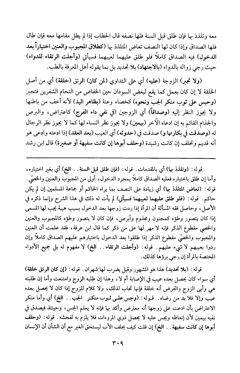 وحاصل فقه المسألة أن المرأة إذا ردت زوجها بعد الدخول بسبب عيبه يجب لها المسمى إذا كان يتصور وطؤه كمجنون ومجذوم وأبرص فإن كان لا يتصور وطؤه كالمجبوب والعنين والخصى مقطوع الذكر فإنه لا مهر لها على من ذكر كما قال ابن عرفة فقد علمت أن العنين والمجبوب والخصى مقطوع الذكر إذا طلقوا بعد الدخول باختيارهم عليهم الصداق كاملا وإن ردوا بعيبهم لا شيء عليهم .