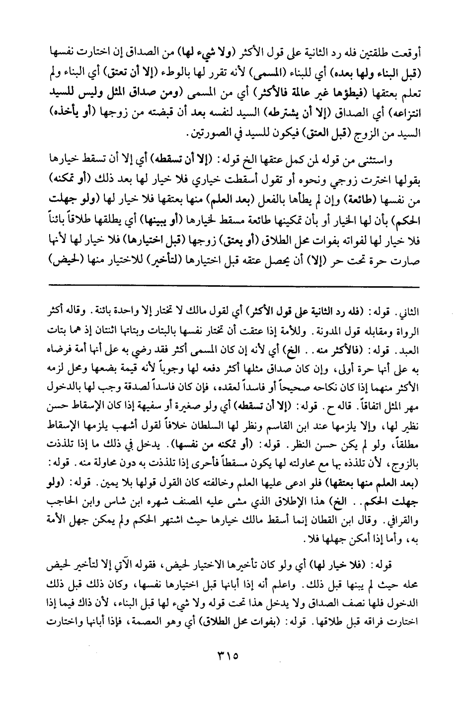 قوله : 16 ( فله رد الثانية على قول الأكثر ) : أي لقول مالك لا تختار إلا واحدة بائنة وقاله أكثر الرواة ومقابله قول المدونة وللأمة إذا عتقت أن تختار نفسها بالبتات وبتاتها اثنتان إذ هما بتات العبد .