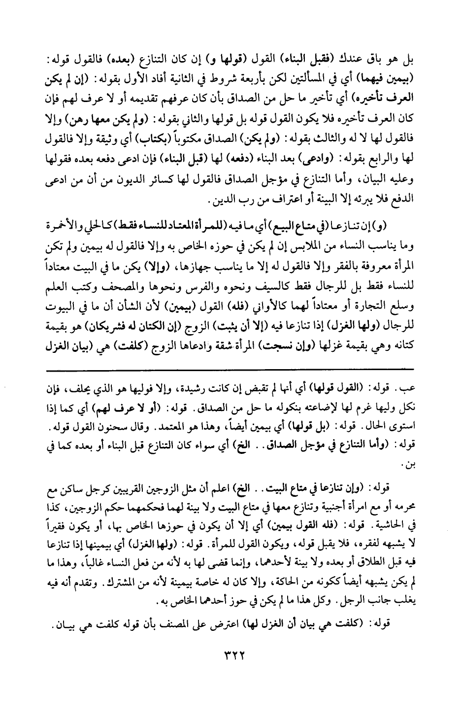 قوله : 16 ( ولها الغزل ) : أي بيمينها إذا تنازعا فيه قبل الطلاق أو بعده ولا بينة لأحدهما وإنما قضى لها به لأنه من فعل النساء غالبا وهذا ما لم يكن يشبهه أيضا ككونه من الحاكة وإلا كان له خاصة بيمينه لأنه من المشترك وتقدم أنه فيه يغلب جانب الرجل وكل هذا ما لم يكن في حوز أحدهما الخاص به .