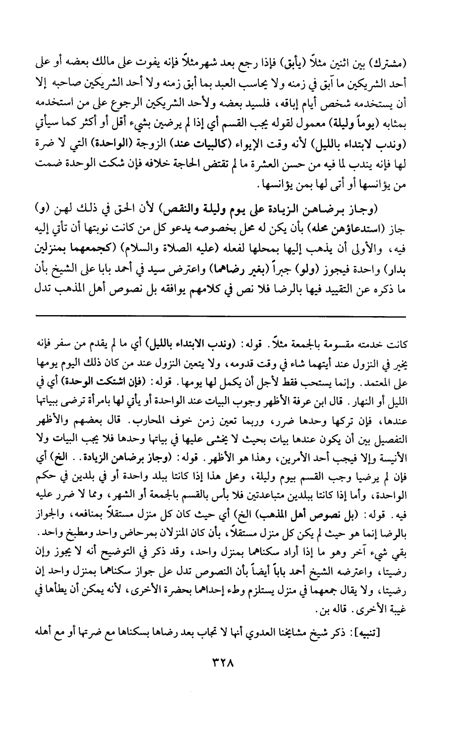 قوله : 16 ( بل نصوص أهل المذهب ) الخ : أي حيث كان كل منزل مستقلا بمنافعه والجواز بالرضا إنما هو حيث لم يكن كل منزل مستقلا بأن كان المنزلان بمرحاض واحد ومطبخ واحد بقي شيء اخر وهو ما إذا أراد سكناهما بمنزل واحد وقد ذكر في التوضيح أنه لا يجوز وإن رضيتا واعترضه الشيخ أحمد بابا أيضا بأن النصوص تدل على جواز سكناهما بمنزل واحد إن رضيتا ولا يقال جمعهما في منزل يستلزم وطء إحداهما بحضرة الأخرى لأنه يمكن أن يطأها في غيبة الأخرى قاله ( بن ) .