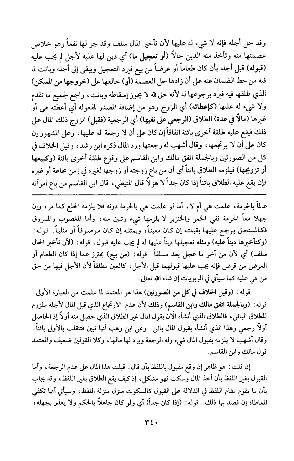 قوله : 16 ( وبالجملة اتفق مالك وابن القاسم ) : ) 16 ( وذلك لأن عدم الارتجاع الذي قبل المال لأجله ملزوم للطلاق البائن فالطلاق الذي أنشأه الآن بقبول المال غير الطلاق الذي حصل منه أولا إذ الحاصل أولا رجعي وهذا الذي أنشأه بقبول المال بائن وعن ابن وهب أنها تبين بالأولى فتنقلب الأولى بائنا وقال أشهب لا يلزمه بقبول المال شيء وله الرجعة ويرد مالها وكلا القولين ضعيف والمعتمد قول مالك وابن القاسم . إن قلت هو ظاهر إن وقع القبول باللفظ بأن قال قبلت هذا المال على عدم الرجعة وأما القبول بغير اللفظ بأن أخذ المال وسكت فهو مشكل إذ كيف يقع الطلاق بغير اللفظ وقد يجاب بأن ما يقوم مقام اللفظ في الدلالة على القبول كالسكوت منزل منزلة اللفظ وسيأتي أنها تكفي المعطاة إن قصد بها ذلك .