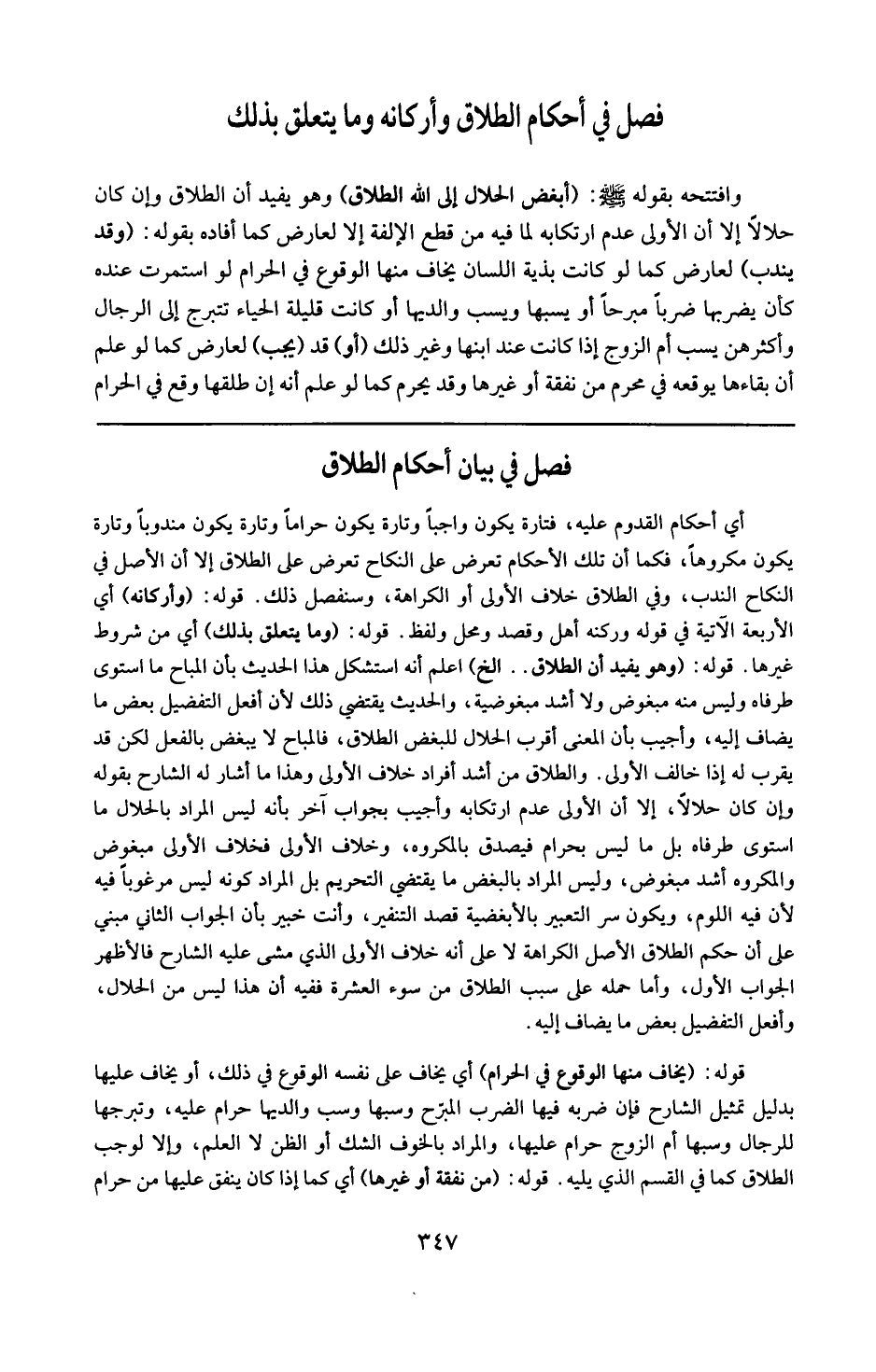قوله : 16 ( وهو يفيد أن الطلاق ) إلخ : اعلم أنه استشكل هذا الحديث بأن المباح ما استوى طرفاه وليس منه مبغوض ولا أشد مبغوضية والحديث يقتضي ذلك لأن أفعل التفضيل بعض ما يضاف إليه . وأجيب بأن المعنى أقرب الحلال للبغض الطلاق . فالمباح لا يبغض بالفعل . لكن قد يقرب له إذا خالف الأولى والطلاق من أشد أفراد خلاف الأولى وهذا ما أشار له الشارح بقوله : وإن كان حلالا إلا أن الأولى عدم ارتكابه . وأجيب بجواب آخر بأنه ليس المراد بالحلال ما استوى طرفاه بل ليس بحرام فيصدق بالمكروه وخلاف الأولى فخلاف الأولى مبغوض والمكروه أشد مبغوضية وليس المراد بالبغض ما يقتضي التحريم بل المراد كونه ليس مرغوبا فيه لأن فيه اللوم ويكون التعبير بالأبغضية قصد التنفير وأنت خبير بأن الجواب الثاني مبني على أن حكم الطلاق الأصلي الكراهة لا على أنه خلاف الأولى الذي مشى عليه الشارح فالأظهر الجواب الأول وأما حمله على سبب الطلاق من سوء العشرة ففيه أن هذا ليس من الحلال وأفعل التفضيل بعض ما يضاف إليه .