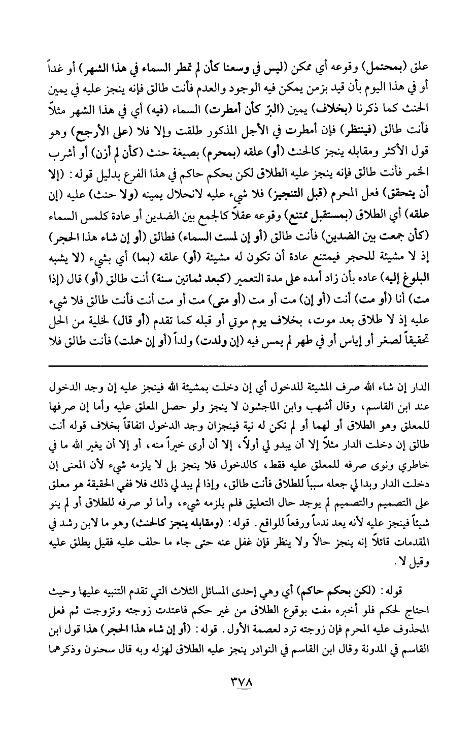 الدار إن شاء الله وصرف المشيئة للدخول أي إن دخلت بمشيئة الله فينجز عليه إن وجد الدخول عند ابن القاسم وقال أشهب وابن الماجشون : لا ينجز ولو حصل المعلق عليه وأما إن صرفها للمعلق وهو الطلاق أو لهما أو لم تكن له نية فينجز إن وجد الدخول اتفاقا بخلاف قوله أنت طالق إن دخلت الدار مثلا إلا أن يبدو لي أو إلا أن أرى خيرا منه أو إلا أن يغير الله ما في خاطري ونوى صرفه للمعلق عليه فقط كالدخول فلا ينجز بل لا يلزمه شيء لأن المعنى : إن دخلت الدار وبدا لي جعله سببا للطلاق فأنت طالق وإذا لم يبد لي ذلك فلا ففي الحقيقة هو معلق على التصميم والتصميم لم يوجد حال التعليق فلم يلزمه شيء وأما لو صرفه للطلاق أو لم ينو شيئا فينجز عليه لأنه يعد ندما ورفعا للواقع .