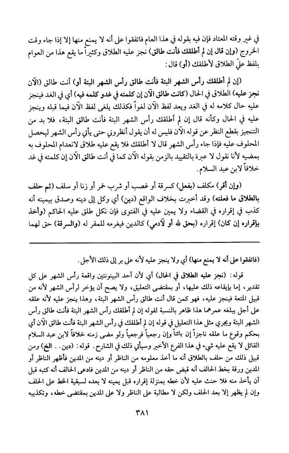 قوله : 16 ( نجز عليه الطلاق في الحال ) : أي لأن أحد البينونتين واقعة رأس الشهر على كل تقدير إما بإيقاعه ذلك عليها أو بمقتضى التعليق ولا يصح أن يؤخر لرأس الشهر لأنه من قبيل المتعة فينجز عليه فهو كمن قال أنت طالق رأس الشهر ألبتة وهذا ينجز عليه لأنه علقه على أجل يبلغه عمرها هذا ظاهر بالنسبة لقوله إن لم أطلقك رأس الشهر ألبتة فأنت طالق رأس الشهر ألبتة ويجري مثل هذا التعليل في قوله إن لم أطلقك في رأس الشهر ألبتة فأنت طالق الآن أي يحكم بوقوع ما علقه ناجزا إن بائنا فبائنا وإن رجعيا فرجعيا ولو مضى زمنه خلافا لابن عبد السلام القائل لا يقع عليه شيء في هذا الفرع الأخير وسيأتي ذلك في الشارح .