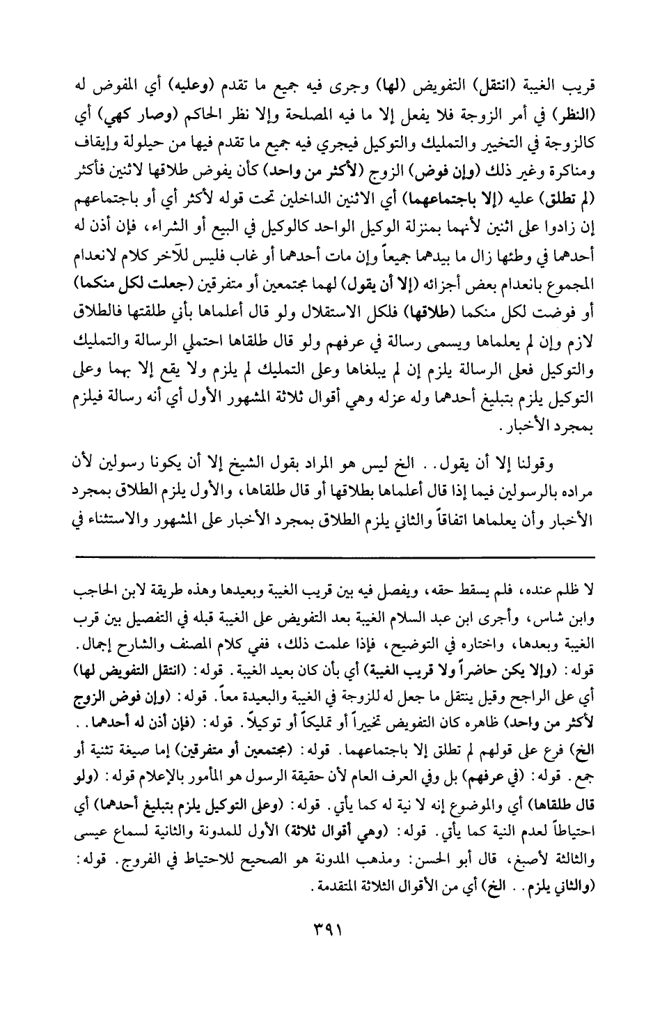 : 16 ( انتقل التفويض لها ) : أي على الراجح وقيل : ينتقل ما جعل له للزوجة في الغيبة القريبة والبعيدة معا .