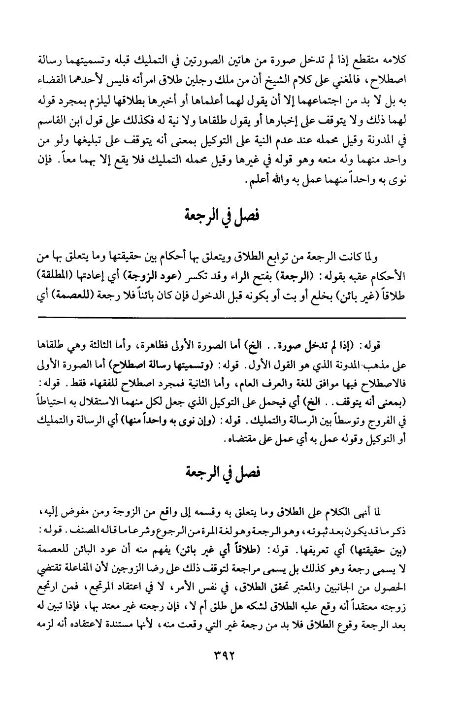 قوله : 16 ( طلاقا أى غير بائن ) : يفهم منه أن عود البائن للعصمة لا يسمى رجعة وهو كذلك بل يسمى مراجعة لتوقف ذلك على رضا الزوجين لأن المفاعلة تقتضي الحصول من الجانبين والمعتبر تحقق الطلاق في نفس الأمر لا في اعتقاد المرتجع فمن ارتجع زوجته معتقدا أنه وقع عليه الطلاق لشكه هل طلق أم لا ؟ فإن رجعته غير معتد بها فإذا تبين له بعد الرجعة وقوع الطلاق فلابد من رجعة غير التي وقعت منه لأنها مستندة لاعتقاده أنه لزمه