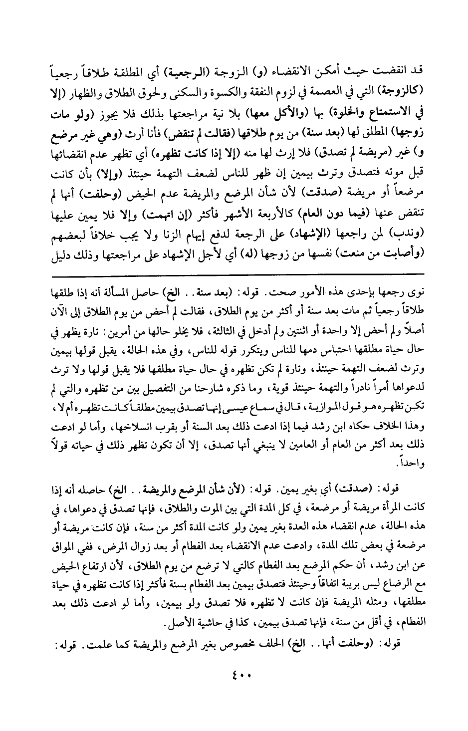 قوله : 16 ( لأن شأن المرضع والمريضة ) إلخ : حاصله أنه إذا كانت المرأة مريضة أو مرضعة فى كل المدة التى بين الموت والطلاق فإنها تصدق فى دعواها فى هذه الحالة عدم انقضاء هذه العدة بغير يمين ولو كانت المدة أكثر من سنة فإن كانت مريضة أو مرضعة بعد تلك المدة وادعت عدم الانقضاء بعد الفطام أو بعد زوال المرض ففى المواق عن ابن رشد أن حكم المرضع بعد الفطام كالتى لا ترضع من يوم الطلاق لأن ارتفاع الحيض مع الرضاع ليس بريبة اتفاقا وحينئذ فتصدق بيمين بعد الفطام بسنة فأكثر إذا كانت تظهره فى حياة مطلقها ومثلها المريضة فإن كانت لا تظهره فلا تصدق ولو بيمين وأما لو ادعت ذلك بعد الفطام فى أقل من سنة فإنها تصدق بيمين كذا فى حاشية الأصل .