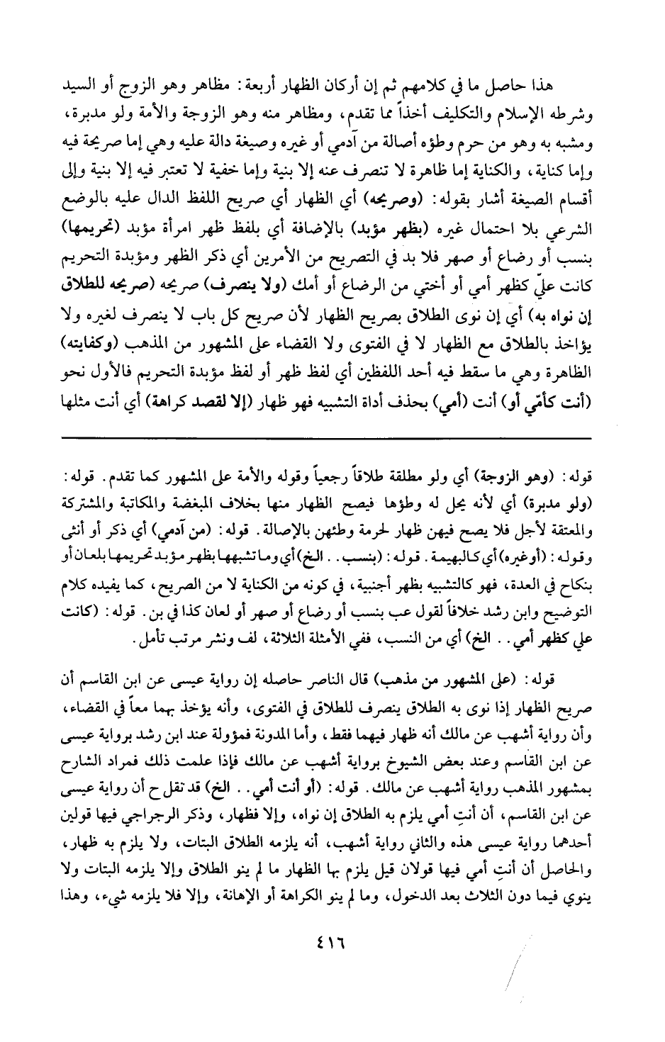 قوله : 16 ( بنسب ) إلخ : أي وأما تشبيهها بظهر مؤبد تحريمها بلعان أو بنكاح في العدة فهو كالتشبيه بظهر أجنبية في كونه من الكناية لا من الصريح كما يفيده كلام التوضيح وابن رشد خلافا لقول ( عب ) : بنسب أو رضاع أو صهر أو لعان كذا في ( بن ) .