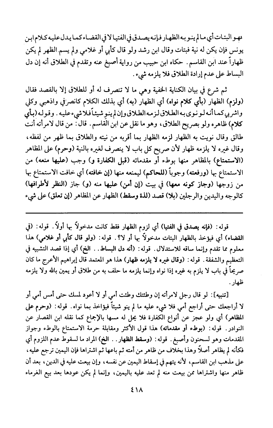 قوله : 16 ( وسقط الظهار ) إلخ : المراد بالسقوط عدم اللزوم أى فكأنه لم يظاهر أصلا وهذا بخلاف من ظاهر من أمته ثم باعها ثم اشتراها فإن اليمين ترجع عليه على مذهب ابن القاسم لأنه يتهم في إسقاط اليمين عن نفسه وإن بيعت عليه في الدين بعد أن ظاهر منها واشتراها ممن بيعت منه لم تعد عليه اليمين وإنما لم يكن عودها بعد بيع الغرماء