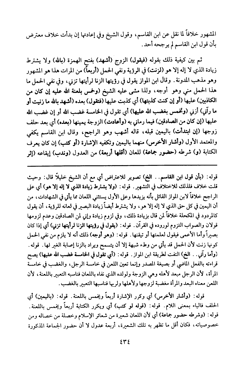 قوله : 16 ( ولا يشترط زيادة الذى لا إله إلا هو ) : أى على الراجح خلافا لابن المواز القائل بأنه يزيدها وعلى الأول يستثنى اللعان مما يأتى فى الشهادات من أن اليمين في كل حق بالله الذى لا إله إلا هو ولا يشترط أيضا زيادة البصير فى لعانه للرؤية أن يقول كالمرود في المكحلة خلافا لمن قال بزيادة ذلك وفي لزوم زيادة وإنى لمن الصادقين وعدم لزومها قولان والصواب اللزوم لوروده فى القران .