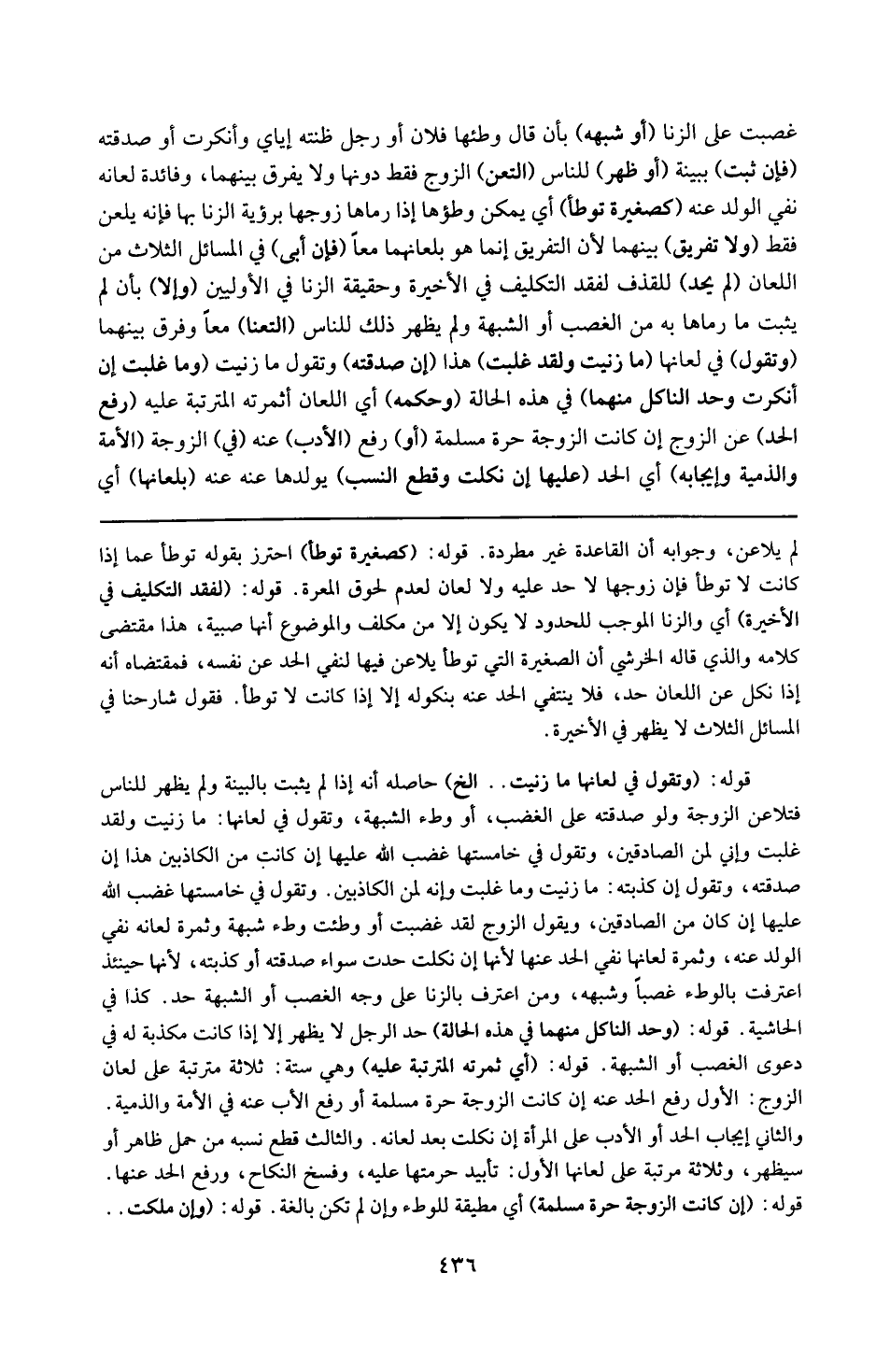 قوله : 16 ( وتقول في لعانها ما زنيت ) إلخ : حاصله أنه إذا لم يثبت بالبينة ولم يظهر للناس فتلاعن الزوجة ولو صدقته على الغصب أو وطء الشبهة وتقول في لعانها : ما زنيت ولقد غلبت وإنى لمن الصادقين وتقول في خامستها : غضب الله عليها إن كانت من الكاذبين هذا إن صدقته وتقول إن كذبته : ما زنيت وما غلبت وإنه لمن الكاذبين وتقول في خامستها : غضب الله عليها إن كان من الصادقين ويقول الزوج : لقد غصبت أو وطئت وطء شبهة . وثمرة لعانه نفى الولد عنه وثمرة لعانها نفى الحد عنها لأنها إن نكلت حدت سواء صدقته أو كذبته لأنها حينئذ اعترفت بالوطء غصبا أو شبهة ومن اعترف بالزنا على وجه الغصب أو الشبهة حد كذا في الحاشية .