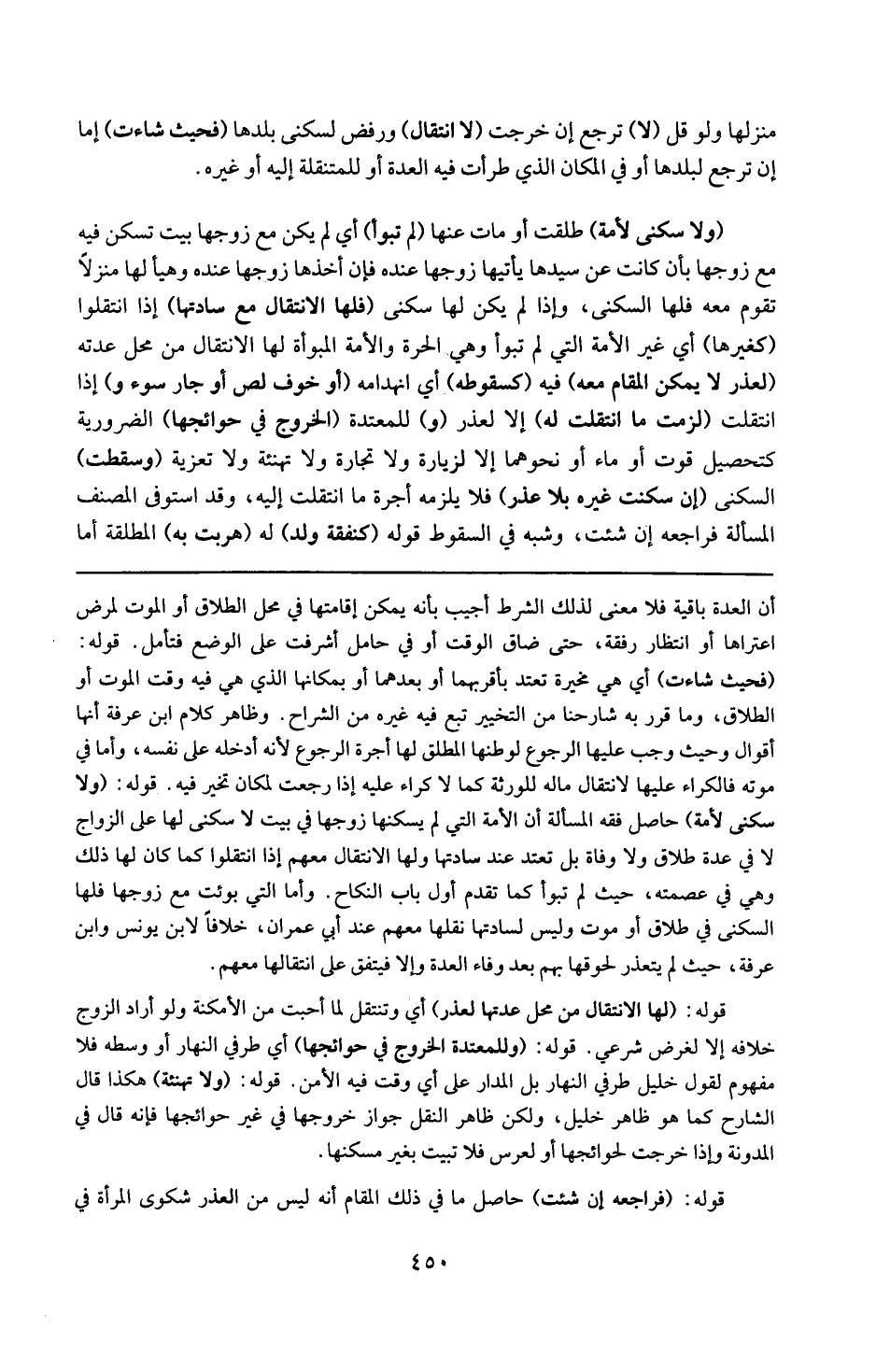 قوله : 16 ( ولا سكنى لأمة ) : حاصل فقه المسألة : أن الأمة التي لم يسكنها زوجها في بيت لا سكنى لها على الزوج لا في عدة طلاق ولا وفاة بل تعتد عند سادتها ولها الانتقال معهم إذا انتقلوا كما كان لها ذلك وهي في عصمته حيث لم تبوأ كما تقدم أول باب النكاح وأما التي بوئت مع زوجها فلها السكنى في طلاق أو موت وليس لساداتها نقلها معهم عند أبي عمران خلافا ل ابن يونس وابن عرفة حيث لم يتعذر لحوقها بهم بعد وفاء العدة وإلا فيتفق على انتقالها معهم .