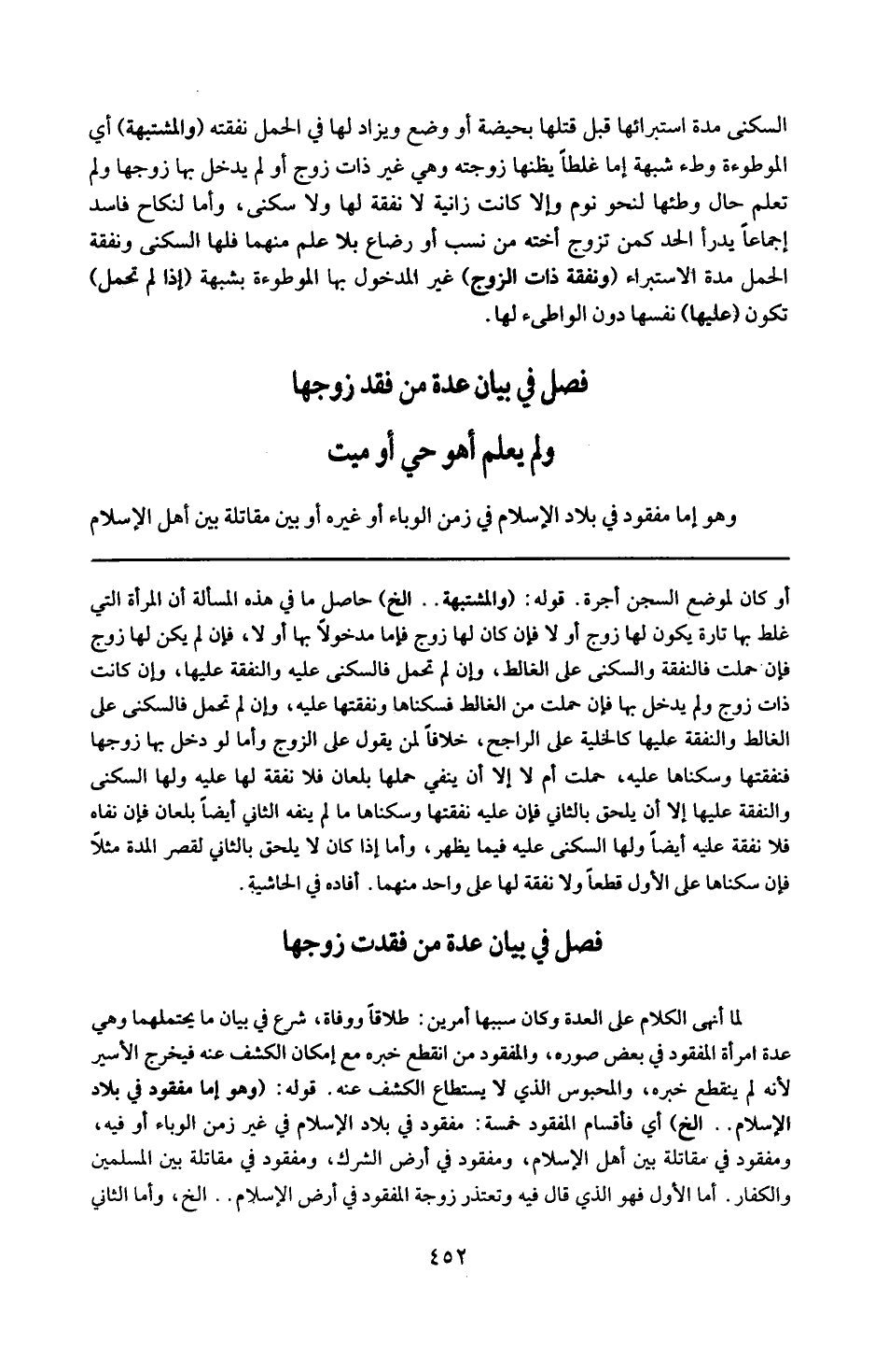 فصل لما أنهى الكلام على العدة وكان سببها أمرين : طلاقا ووفاة شرع في بيان ما يحتملهما وهي عدة امرأة المفقود في بعض صوره .