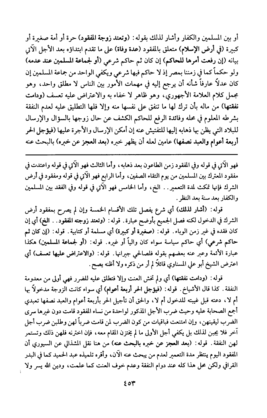 قوله : 16 ( بعد العجز عن خبره بالبحث عنه ) : من هنا نقل المشذالى عن السيورى أن المفقود اليوم ينتظر مدة التعمير لعدم من يبحث عنه الآن وأقره تلميذه عبد الحميد كما في البدر القرافى . ولكن محل هذا كله عند دوام النفقة وعدم خوف العنت كما علمت ودين الله يسر ولا