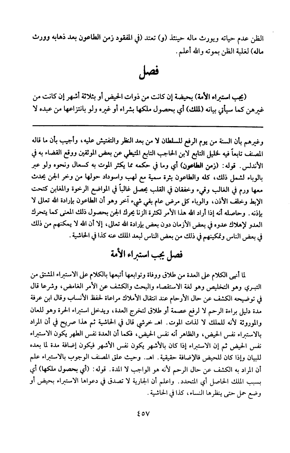لما أنهى الكلام على العدة من طلاق ووفاة وتوابعها أتبعها بالكلام على الاستبراء المشتق من التبري وهو التخليص وهو لغة الاستقصاء والبحث والكشف عن الأمر الغامض وشرعا قال في توضيحه : الكشف عن حال الأرحام عند انتقال الإملاك مراعاة لحفظ الأنساب . وقال ابن عرفه : مدة دليل براءة الرحم لا لرفع عصمة أو طلاق . لتخرج العدة ويدخل استبراء الحرة وهو اللعان والموروثة لأنه للملك لا لذات الموت ( 1 هـ خرشي ) . قال في الحاشيه . ثم هذا صريح في أن المراد بالاستبراء نفس الحيض والظاهر أنه نفس الحيض فكما أن العدة نفس الطهر يكون الاستبراء نفس الحيض . ثم إن الاستبراء إذا كان بالأشهر يكون نفس الأشهر . فيكون إضافة مدة لما بعده للبيان وإذا كان للحيض فالإضافة حقيقية ا ( 1 هـ ) . وحيث علق المصنف الوجوب بالاستبراء علم أن المراد به الكشف عن حال الرحم لأنه هو الواجب لا المدة .