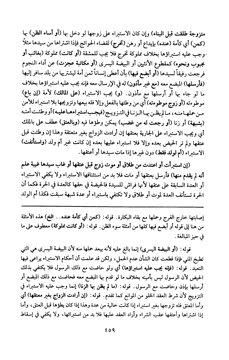قوله : 16 ( أو البيضة اليسرى ) : إنما بالغ عليه لأنه يبعد حملها منه لأن البيضة اليسرى هي التي تطبخ المني فإذا قطعت كان الشأن عدم الحمل ولكن قد علمت أن أحكام الاستبراء يراعى فيها التعبد . قوله : 16 ( فإنه يجب عليه استبراؤها ) : أي ولو حاضت مع ذلك الرسول فلا يكتفي بذلك الحيض لأن الرسول ليس بامينه بخلاف لو قدم بها المبضع معه فحاضت مع ذلك المبضع أو أرسلها بإذن وحاضت مع الرسول .