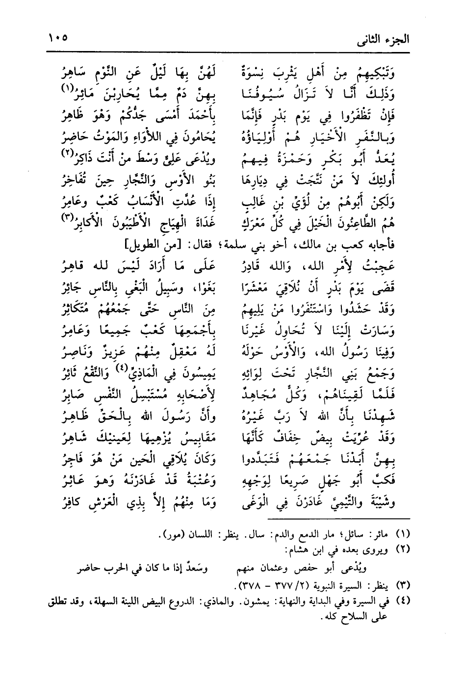 (قَضَى يَوْمَ بَدْرٍ أَنْ نُلاَقِي مَعْشَرًا ... بَغَوا وسَبِيلُ الْبَغْيِ بِالنَّاسِ جَائِرُ)