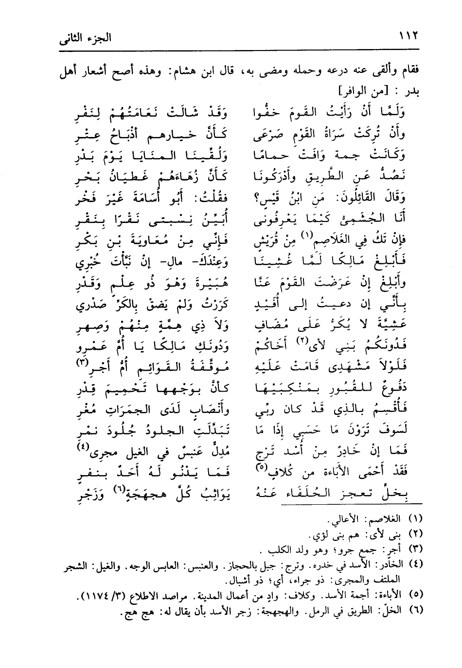 فَقَامَ وَألقى عَنهُ درعه وَحمله وَمضى بِهِ قَالَ ابْن هِشَام وَهَذِه أصح أشعار أهل بدر // (من الوافر) //