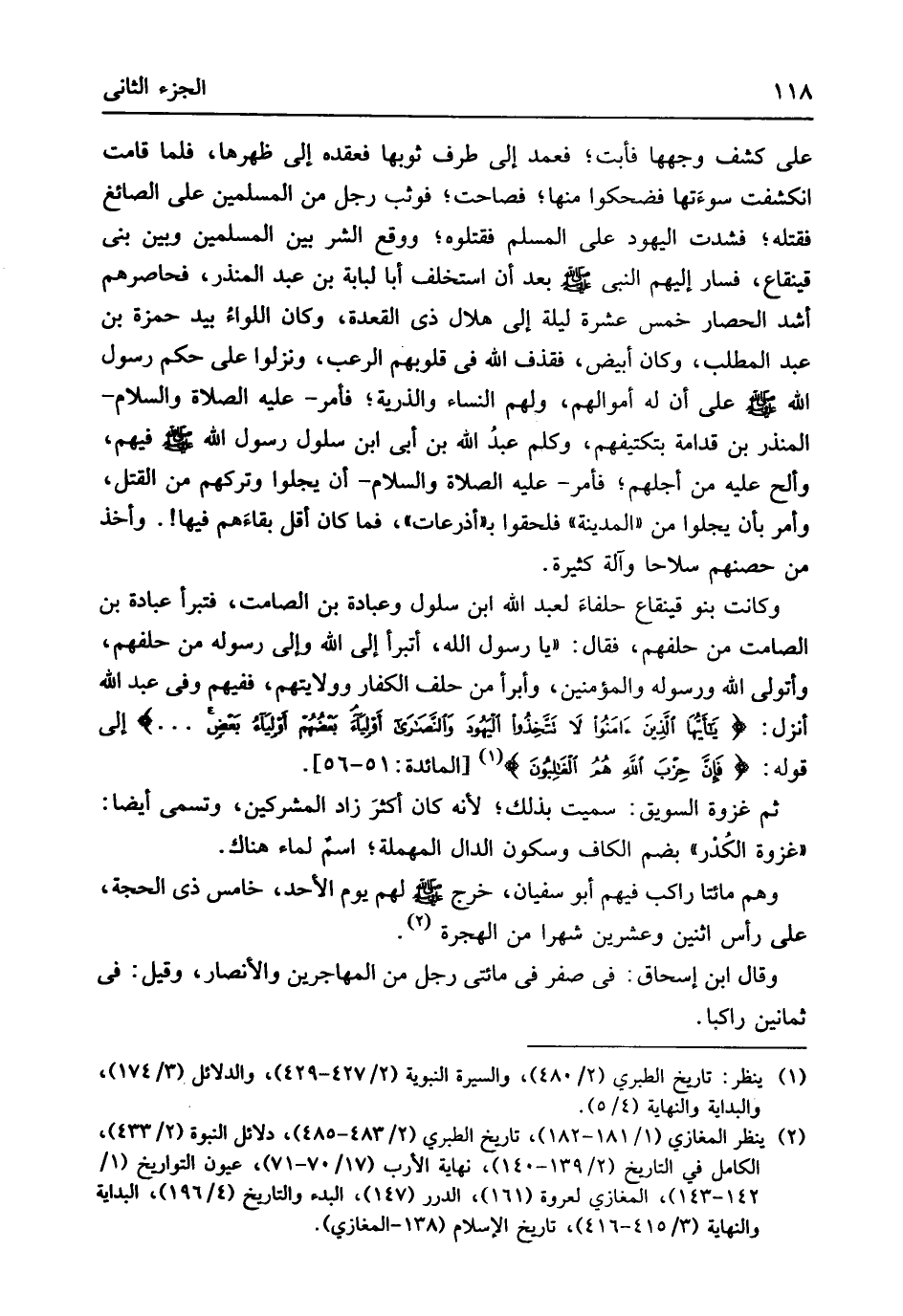 على أَن لَهُ أَمْوَالهم وَلَهُم النِّسَاء والذرية فَأمر عَلَيْهِ الصَّلَاة وَالسَّلَام الْمُنْذر بن قدامَة بتكتيفهم وكلم عَلَيْهِ الصَّلَاة وَالسَّلَام أَن يجلوا وتركهم من الْقَتْل وَأمر بِأَن يجلوا من الْمَدِينَة فَلَحقُوا بأذرعات فَمَا كَانَ أقل بقاءهم فِيهَا وَأخذ من حصنهمْ سِلَاحا وَآلَة كَثِيرَة وَكَانَت بَنو قينقاع حلفاءَ لعبد الله ابْن سلول وَعبادَة بن الصَّامِت فتبرأ عبَادَة بن الصَّامِت من حلفهم فَقَالَ يَا رَسُول الله أَتَبرأ إِلَى الله وَإِلَى رَسُوله من حلفهم وأتولى الله وَرَسُوله على الْمُؤمنِينَ وَأَبْرَأ من حلف الْكفَّار وولايتهم ففيهم وَفِي عبد الله أنزل ( {يَا أَيهَا الذينَ آمَنُوا لَا تَتَّخِذوْا اليهودَ والنَصَارى أوْلِياءَ بعْضُهُمُ أولياءَ بعضٍ} إِلَى قَوْله ( {فإنَ حِزْبَ الله هم الغالبون} ثمَّ غَزْوَة السويق سميت بذلك لِأَنَّهُ كَانَ أكثرَ زَاد الْمُشْركين وَتسَمى أَيْضا غَزْوَة الكُدر بِضَم الْكَاف وَسُكُون الدَّال الْمُهْملَة اسْم لماء هُنَاكَ وهم مِائَتَا رَاكب فيهم أَبُو سُفْيَان خرج