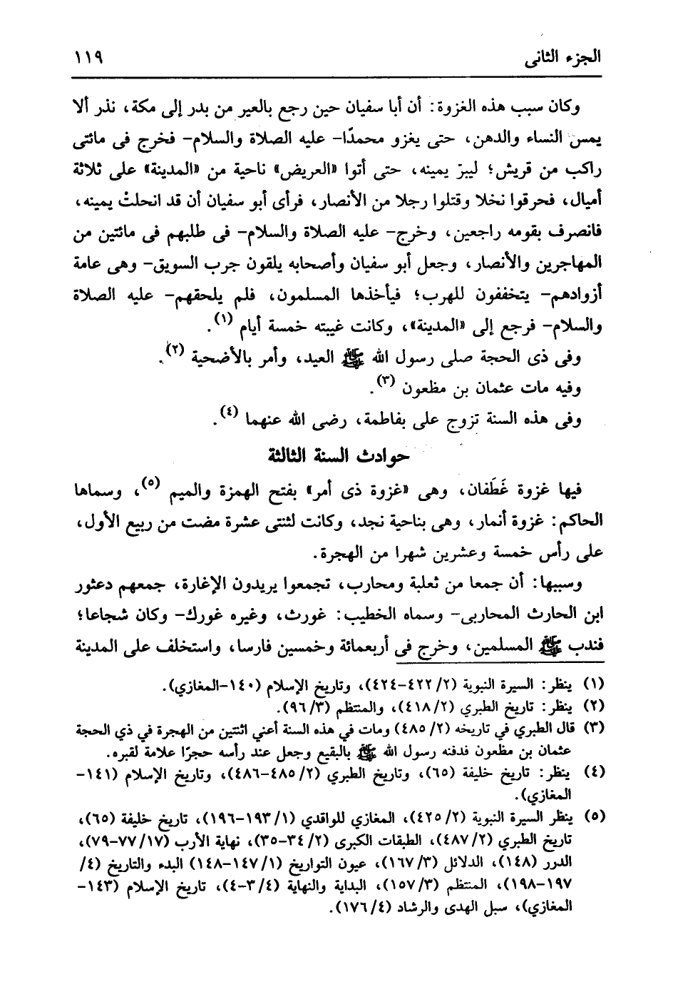 وَكَانَ سَبَب هَذِه الْغَزْوَة إِن أَبَا سُفْيَان حِين رَجَعَ بالعير من بدر إِلَى مَكَّة نذر أَلا يمس النِّسَاء والدهن حَتَّى يَغْزُو مُحَمَّدًا عَلَيْهِ الصَّلَاة وَالسَّلَام فَخرج فِي مِائَتي رَاكب من قُرَيْش ليبر يَمِينه حَتَّى أَتَوا العريض نَاحيَة من الْمَدِينَة على ثَلَاثَة أَمْيَال فحرقوا نخلا وَقتلُوا رجلا من الْأَنْصَار فَرَأى أَبُو سُفْيَان أَن قد انْحَلَّت يَمِينه فَانْصَرف بقَوْمه رَاجِعين وَخرج عَلَيْهِ الصَّلَاة وَالسَّلَام فِي طَلَبهمْ فِي مِائَتَيْنِ من الْمُهَاجِرين وَالْأَنْصَار وَجعل أَبُو سُفْيَان وَأَصْحَابه يلقون جرب السويق وَهِي عَامَّة أَزْوَادهم يتخففون للهرب فيأخذها الْمُسلمُونَ فَلم يلحقهم عَلَيْهِ الصَّلَاة وَالسَّلَام فَرجع إِلَى الْمَدِينَة وَكَانَت غيبته خَمْسَة أَيَّام وَفِي ذِي الْحجَّة صلى رَسُول الله