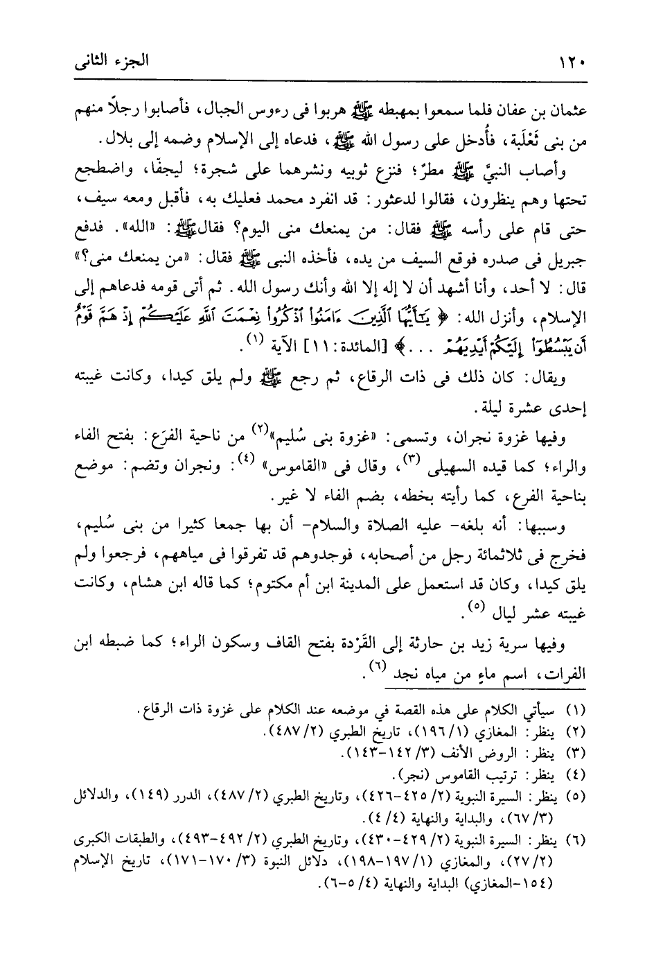 وَلم يلق كيداً وَكَانَت غيبته إِحْدَى عشرَة لَيْلَة وفيهَا غَزْوَة نَجْرَان وَتسَمى غَزْوَة بني سُليم من نَاحيَة الفرَع بِفَتْح الْفَاء وَالرَّاء كَمَا قَيده السُّهيْلي وَقَالَ فِي الْقَامُوس ونجران وتضم مَوضِع بِنَاحِيَة الْفَرْع كَمَا رَأَيْته بِخَطِّهِ بِضَم الْفَاء لَا غير وسببها أَنه بلغه عَلَيْهِ الصَّلَاة وَالسَّلَام أَن بهَا جمعا كثيرا من بني سُليم فَخرج فِي ثَلَاثمِائَة رجل من أَصْحَابه فوجدوهم قد تفَرقُوا فِي مِيَاههمْ فَرَجَعُوا وَلم يلق كيداً وَكَانَ قد اسْتعْمل على الْمَدِينَة ابْن أم مَكْتُوم كَمَا قَالَه ابْن هِشَام وَكَانَت غيبته عشر لَيَال وفيهَا سَرِيَّة زيد بن حَارِثَة إِلَى القَرْدة بِفَتْح الْقَاف وَسُكُون الرَّاء كَمَا ضَبطه ابْن الْفُرَات اسْم مَاء من مياه نجد