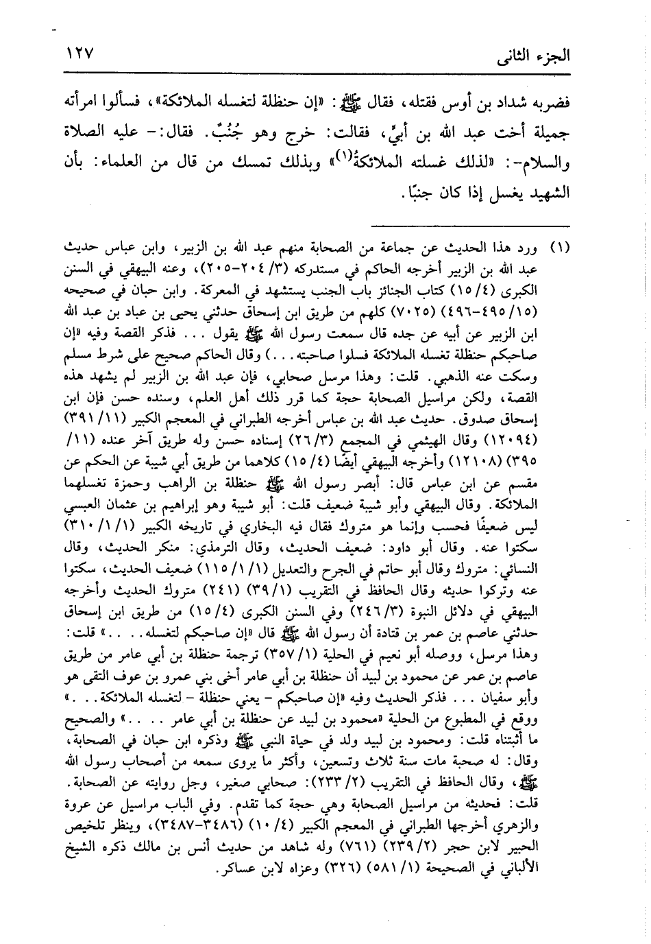 إِن حَنْظَلَة لتغسله الْمَلَائِكَة فسألوا امْرَأَته جميلَة أُخْت عبد الله بن أبي فَقَالَت خرج وَهُوَ جُنُب فَقَالَ عَلَيْهِ الصَّلَاة وَالسَّلَام لذَلِك غسلته الملائكةُ وَبِذَلِك تمسك من قَالَ من الْعلمَاء بِأَن الشَّهِيد يغسل إِذا كَانَ جنبَاً