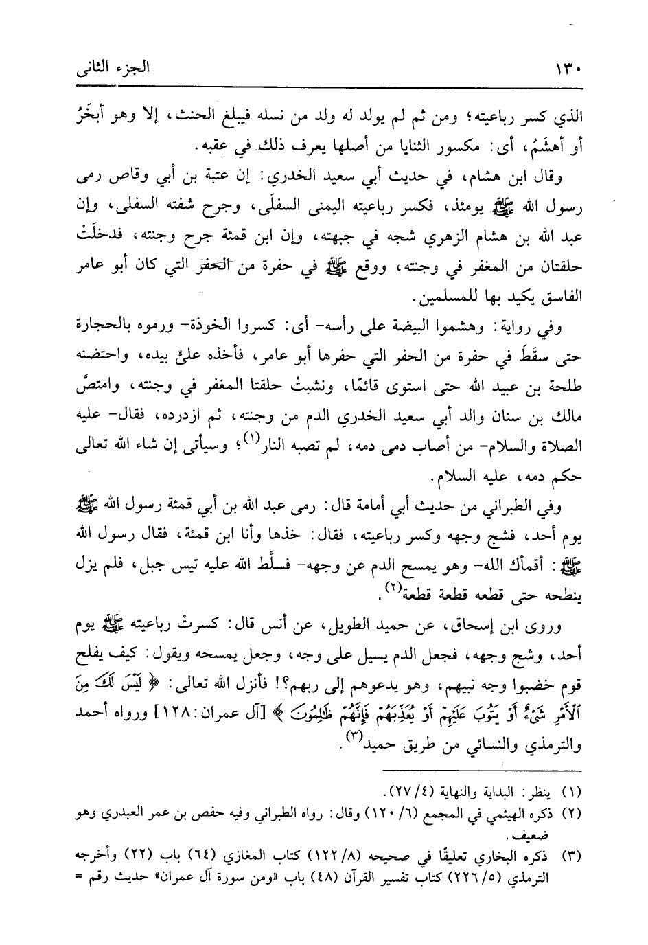 يَوْمئِذٍ فَكسر رباعيته الْيُمْنَى السفلَى وجرح شفته السُّفْلى وَإِن عبد الله بن هِشَام الزُّهْرِيّ شجه فِي جَبهته وَإِن ابْن قمئة جرح وجنتة فدخلَتْ حلقتان من المغفر فِي وجنته وَوَقع