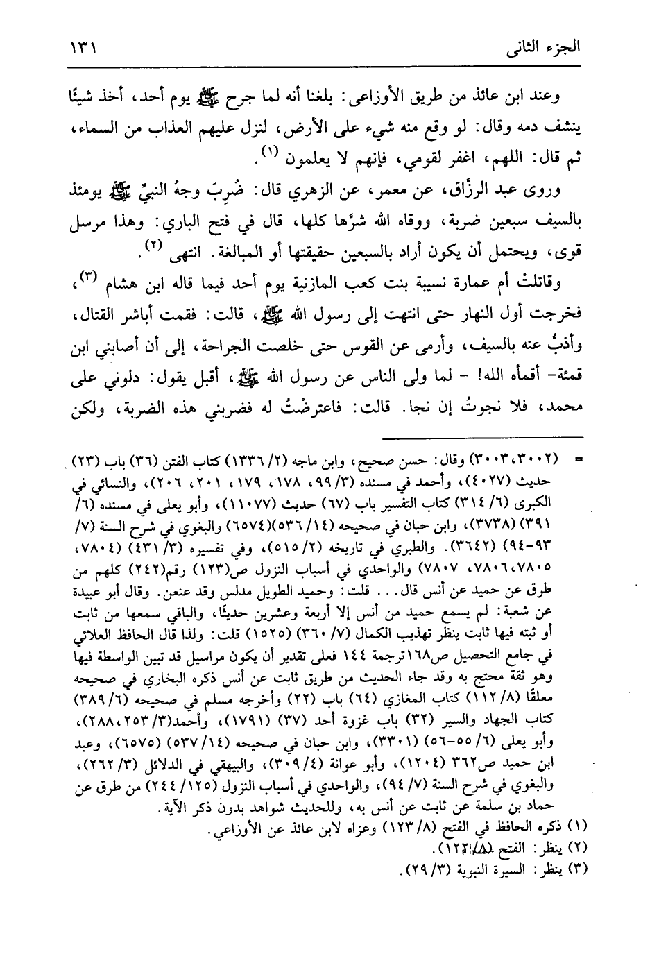 يَوْمئِذٍ بِالسَّيْفِ سبعين ضَرْبَة ووقاه الله شَرها كلهَا قَالَ فِي فتح الْبَارِي وَهَذَا مُرْسل قوي وَيحْتَمل أَن يكون أَرَادَ بالسبعين حَقِيقَتهَا أَو الْمُبَالغَة انْتهى وقاتلت أم عمَارَة نسيبة بنت كَعْب المازنية يَوْم أحد فِيمَا قَالَه ابْن هِشَام فَخرجت أول النَّهَار حَتَّى انْتَهَت إِلَى رَسُول الله