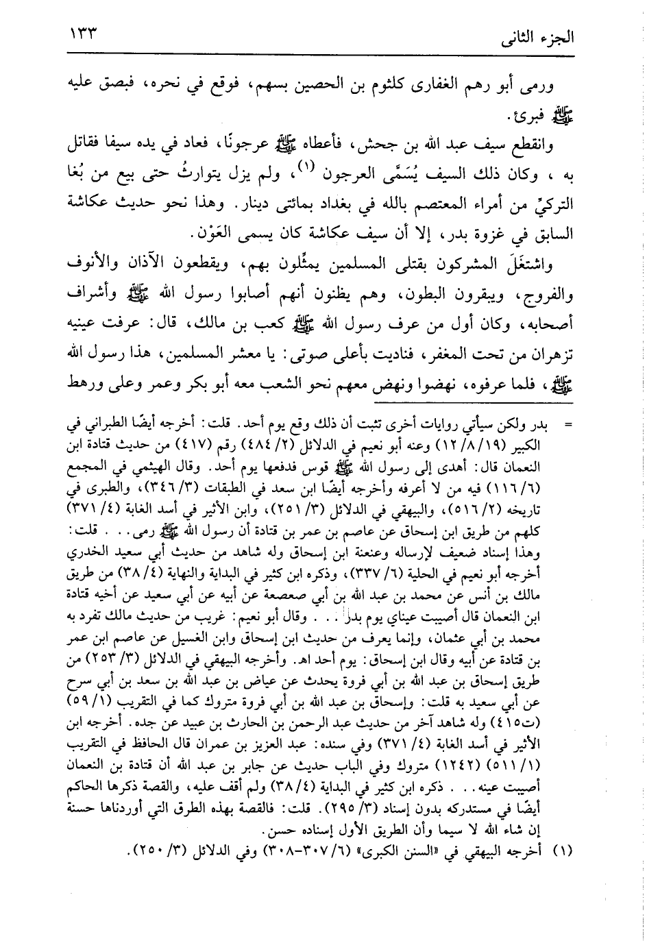 عرجوناً فَعَاد فِي يَده سَيْفا فقاتل بِهِ وَكَانَ ذَلِك السَّيْف يُسمى العرجون وَلم يزل يتوارثُ حَتَّى بيع من بُغا التركي من أُمَرَاء المعتصم بِاللَّه فِي بَغْدَاد بِمِائَتي دِينَار وَهَذَا نَحْو حَدِيث عكاشة السَّابِق فِي غَزْوَة بدر إِلَّا أَن سيف عكاشة كَانَ يُسمى العَوْن واشتغَلَ الْمُشْركُونَ بقتلى الْمُسلمين يمثلون بهم ويقطعون الآذان والأنوف والفروج ويبقرون الْبُطُون وهم يظنون أَنهم أَصَابُوا رَسُول الله