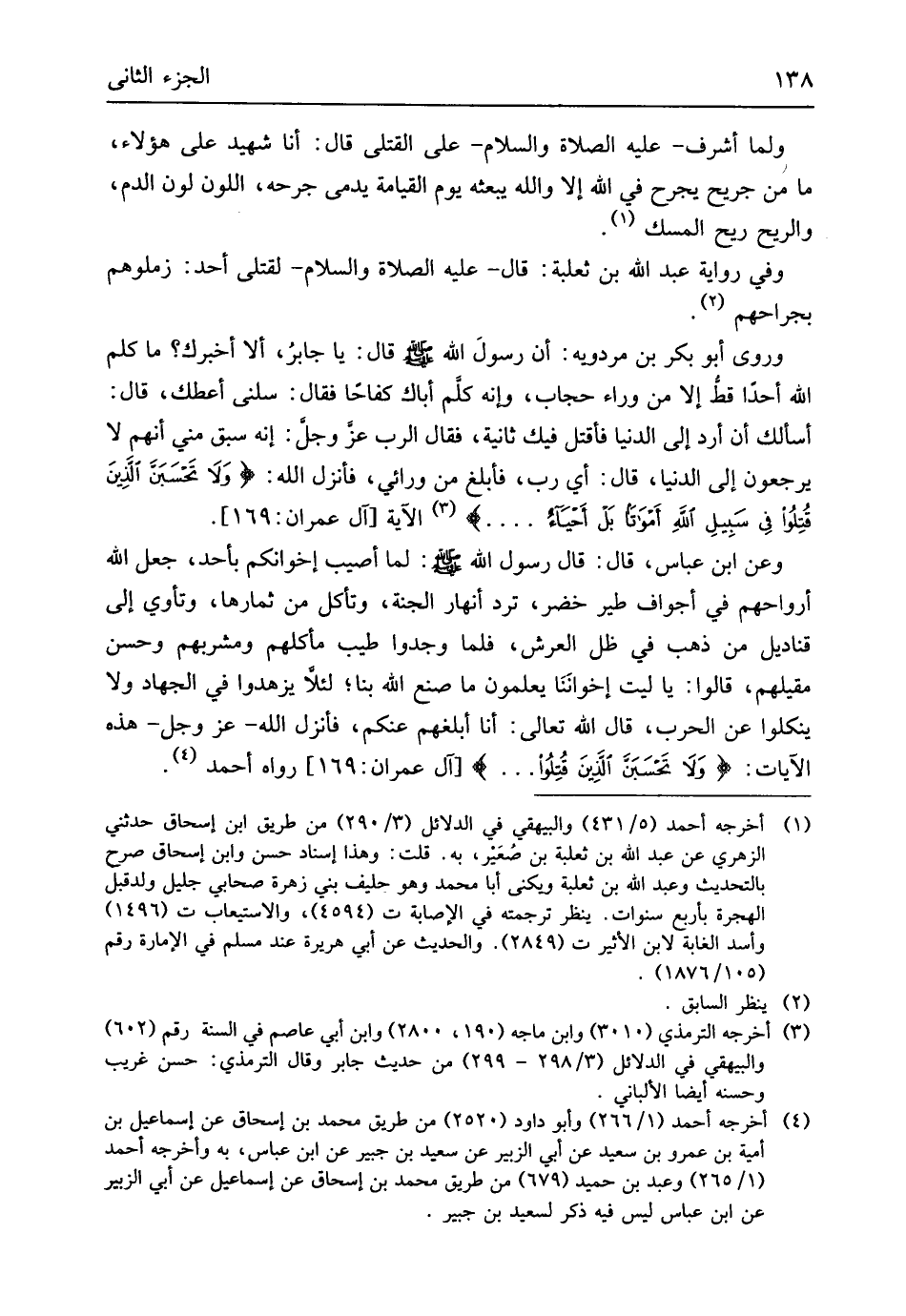 قَالَ يَا جَابر أَلا أخْبرك مَا كلم الله أحدا قطّ إِلَّا من وَرَاء حجاب وَإنَّهُ كلم أَبَاك كفاحاً فَقَالَ سلني أعطك قَالَ أَسأَلك أَن أرد إِلَى الدُّنْيَا فأقتل فِيك ثَانِيَة فَقَالَ الرب عز وَجل إِنَّه سبق مني أنهمِ لَا يرجعُونَ إِلَى الدُّنْيَا قَالَ أَي رب فأبلغ من ورائي فَأنْزل الله ( {وَلا تحسَبَنَ الَذِينَ قُتِلوا فِي سَبِيل الله أَمْوَاتًا بل أَحيَاء} وَعَن ابْن عَبَّاس قَالَ قَالَ رَسُول الله